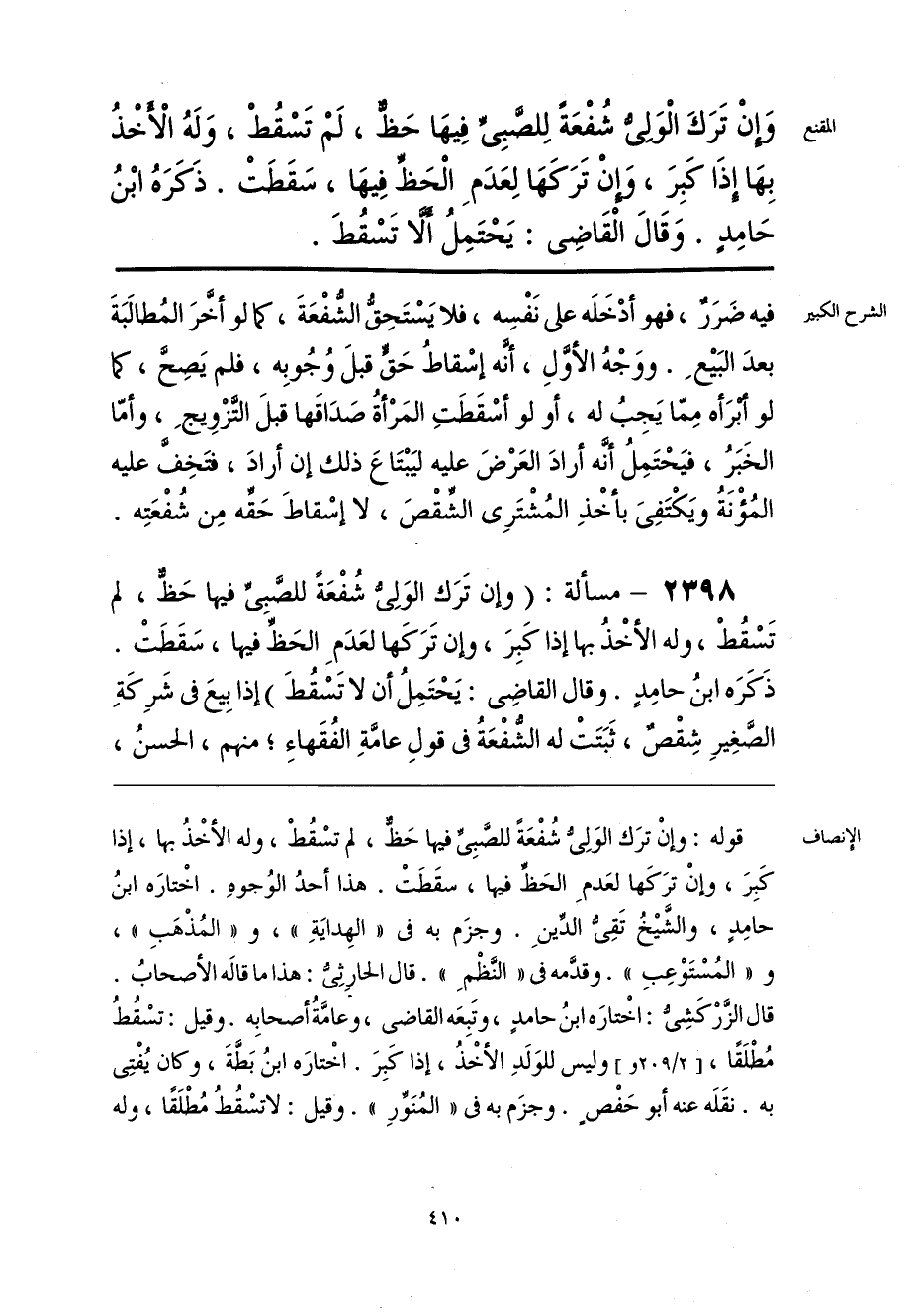 قوله: وإنْ ترَك الوَلِيُّ شُفْعَةً للصَّبِيِّ فيها حَظٌّ، لم تسْقُطْ، وله الأخْذُ بها، إذا كَبِرَ، وإنْ ترَكَها لعَدمِ الحَظِّ فيها، سقَطَتْ. هذا أحدُ الوُجوهِ. اخْتارَه ابنُ حامِدٍ، والشَّيخُ تَقِيُّ الدِّينِ. وجزَم به في «الهِدايَةِ»، و «المُذْهَبِ»، و «المُسْتَوْعِبِ». وقدَّمه في «النَّظْمِ». قال الحارثِيُّ: هذا ما قاله الأصحابُ. قال الزَّرْكَشِيُّ: اخْتارَه ابنُ حامدٍ، وتَبِعَه القاضي، وعامَّةُ أصحابِه. وقيل: تسْقُطُ مُطْلَقًا، وليس للوَلَدِ الأخْذُ، إذا كَبِرَ. اخْتارَه ابنُ بَطَّةَ، وكان يُفْتِي به. نقَلَه عنه أبو حَفْصٍ. وجزَم به في «المُنَوِّرِ». وقيل: لا تسْقُطُ مُطْلَقًا، وله