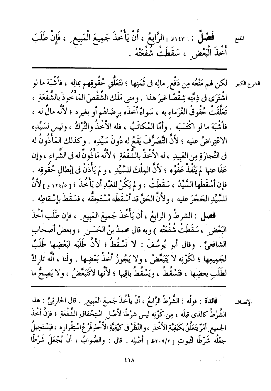 فائدة: قولُه: الشَّرْطُ الرَّابعُ، أنْ يأْخُذَ جَميعَ المَبِيعِ. قال الحارِثِيُّ: هذا الشَّرْطُ كالذي قبلَه، مِن كَوْنِه ليس شرْطًا لأصْلِ اسْتِحْقاقِ الشُّفْعَةِ؛ فإنَّ أخْذَ الجميعِ أمْرٌ يتَعَلَّقُ بكَيفِيَّةِ الأخْذِ، والنَّظَرُ في كيفِيَّةِ الأخْذِ فَرْعُ اسْتِقْرارِه، فيَسْتَحِيلُ جعْلُه شَرْطًا لثُبوتِ أصْلِه. قال: والصَّوابُ، أنْ يُجْعَلَ شَرْطًا