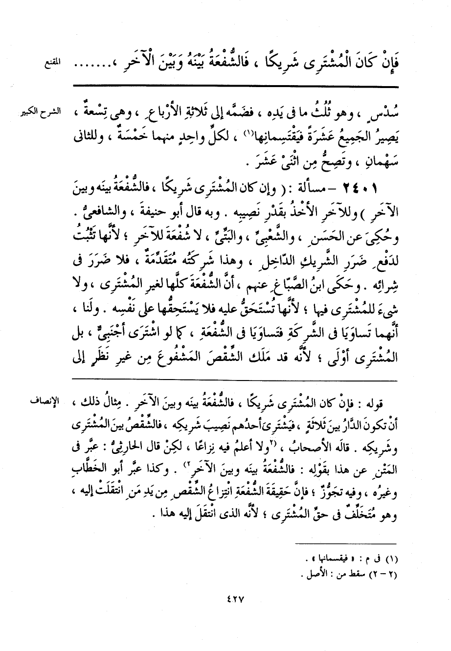 قوله: فإنْ كان المُشْتَرِي شَرِيكًا، فالشُّفْعَةُ بينَه وبينَ الآخَرِ. مِثالُ ذلك، أنْ تكونَ الدَّارُ بينَ ثَلاثَةٍ، فيَشْتَرِيَ أحدُهم نَصِيبَ شَرِيكِه، فالشِّقْصُ بينَ المُشْتَرِي وشَرِيكِه. قاله الأصحابُ، [ولا أعلمُ فيه نِزاعًا، لكِنْ قال الحارِثِيُّ: عبَّر في المَتْنِ عن هذا بقَوْلِه: فالشُّفْعَةُ بينَه وبينَ الآخَرِ] (¬1). وكذا عبَّر أبو الخَطَّابِ وغيرُه، وفيه تجَوُّزٌ؛ فإنَّ حَقِيقَةَ الشُّفْعَةِ انْتِزاعُ الشِّقْصِ مِن يَدِ مَنِ انْتقَلَتْ إليه، وهو مُتَخَلِّفٌ في حقِّ المُشْتَرِي؛ لأنَّه الذي انْتقَلَ إليه هذا.