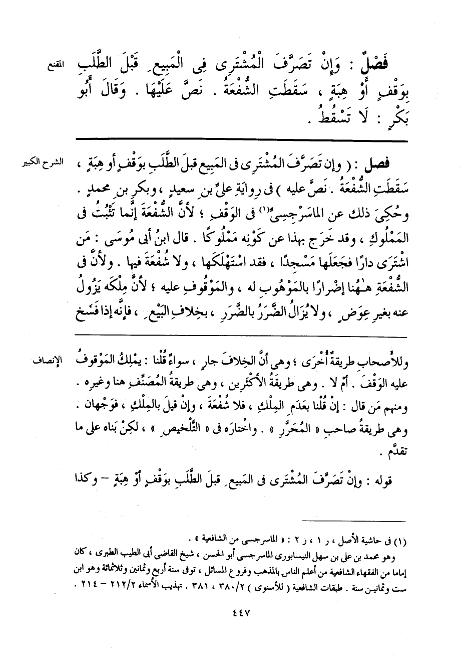 وللأَصحاب طريقةٌ أُخْرَى؛ وهي أنَّ الخِلافَ جارٍ، سواءٌ قُلْنا: يمْلِكُ المَوْقوفُ عليه الوَقْفَ. أمْ لا. وهي طريقَةُ الأكْثَرِين، وهي طريقةُ المُصَنِّفِ هنا وغيرِه. ومنهم مَن قال: إنْ قُلْنا بعَدَم المِلْكِ، فلا شُفْعَةَ، وإنْ قيلَ بالمِلْكِ، فوَجْهان. وهي طريقةُ صاحبِ «المُحَرَّرِ». واخْتارَه في «التَّلْخيصِ»، لكِنْ بَناه على ما تقدَّم.