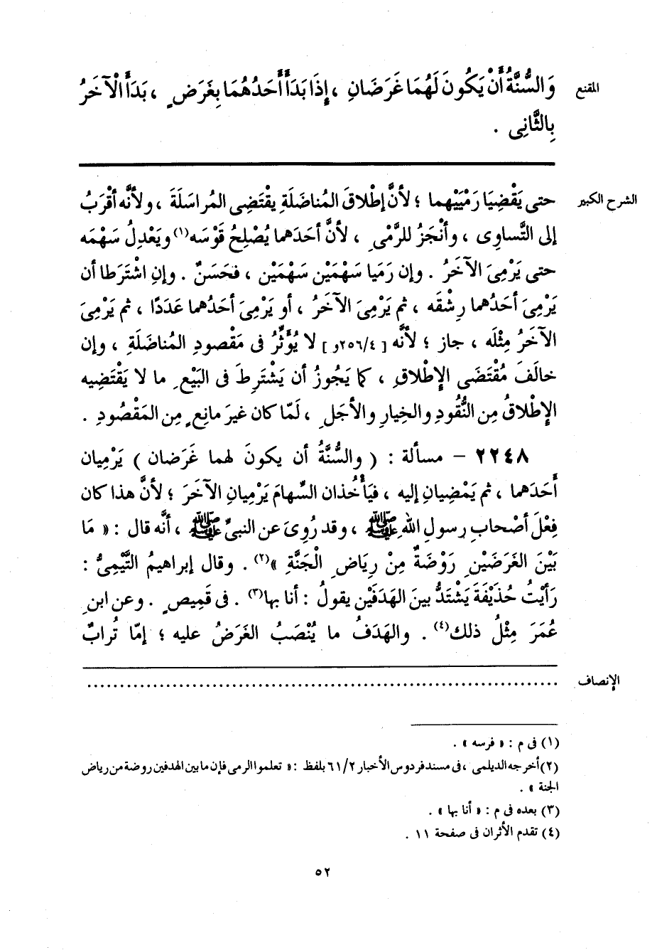 وَالسُّنَّةُ أنْ يَكُونَ لَهُمَا غَرَضَانِ، إذَا بَدَأَ أَحَدُهُمَا بِغرَضٍ، بَدَأَ الْآخَرُ بِالثَّانِي.
