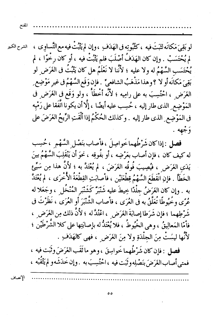 فصل: إذا كان شَرْطُهما خَواصِلَ، فأصاب بنَصْلِ السَّهْمِ، حُسِب له كيف كان، فإن أصاب بعَرْضِه، أو بفُوقِه، نحوَ أن يَنْقَلِبَ السَّهْمُ بينَ يَدَي الغَرَضِ، فيُصِيبَ فُوقُه الغَرَضَ، لم يُعْتَدَّ به؛ لأنَّ هذا مِن سَيِّئِ الخَطَأ. فإنِ انْقَطَعَ السَّهْمُ قِطْعَتَين، فأصابَتِ القِطْعَةُ الأُخْرَى، لم يُعْتَدَّ به. وإن كان الغَرَضُ جِلْدًا خِيطَ عليه شَنْبَرٌ كَشَنْبَرِ المُنْخُلِ، وجَعَلا له عُرًى وخُيُوطًا تُعَلَّقُ به في العُرَى، فأصاب الشَّنْبَرَ أو العُرَى، نَظَرْتَ في شَرْطِهما؛ فإن شَرَطا إصابَةَ الغَرَضِ، اعْتُدَّ له؛ لأنَّ ذلك مِن الغَرَضِ، فأمّا المَعالِيقُ، وهي الخُيُوطُ، فلا يُعْتَدُّ له بإصابَتِها على كلا الشَّرْطَين؛ لأنَّها ليسَتْ مِنَ الجِلْدَةِ ولا مِنَ الغَرَضِ، فهي كالهَدَفِ.