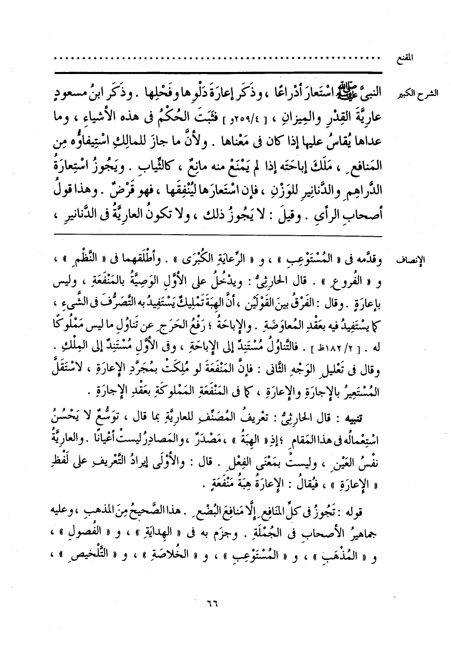 تنبيه: قال الحارِثِيُّ: تعْريفُ المُصَنِّفِ للعارِيَّةِ بما قال، توَسُّعٌ لا يَحْسُنُ اسْتِعْمالُه في هذا المَقامِ؛ إذِ «الهِبَةُ»، مَصْدَرٌ، والمَصادِرُ ليستْ أعْيانًا. والعارِيَّة نفْسُ العَينِ، وليستْ بمَعْنَى الفِعْلِ. قال: والأوْلَى إيرادُ التَّعْريفِ على لَفْظِ «الإِعارَةِ»، فيُقالُ: الإِعارَةُ هِبَةُ مَنْفَعَةٍ.