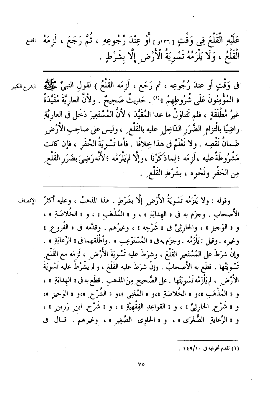 وقوله: ولا يَلْزَمُه تَسْويَةُ الأرْضِ إلَّا بشَرْطٍ. هذا المذهبُ، وعليه أكثرُ الأصحابِ. وجزَم به في «الهِدايَةِ»، و «المُذْهَبِ»، و «الخُلاصَةِ»، و «الوَجيزِ»، والحارِثِيُّ في «شَرْحِه»، وغيرُهم. وقدَّمه في «الفُروعِ» وغيرِه. وقيل: يَلْزَمُه. وجزَم به في «المُسْتَوْعِبِ». وأطْلَقهما في «الرِّعايَةِ». وإنْ شرَطَ على المُسْتَعيرِ القَلْعَ، وشرَطَ عليه تَسْويَةَ الأرْضِ، لَزِمَه مع القَلْعِ تَسْويَتُها. قطَع به الأصحابُ. وإنْ شرَطَ عليه القَلْعَ، ولم يشْرُطْ عليه تَسْويَةَ الأرْضِ، لم يَلْزَمْه تَسْويَتُها. على الصَّحيحِ مِنَ المذهبِ. قطَع به في «الهِدايَةِ»، و «المُذْهَبِ»، و «الخُلاصَةِ»، و «المُغْنِي»، و «الشَّرْحِ»، و «الوَجيزِ»، و «شَرْحِ الحارِثِيِّ»، و «القواعِدِ الفِقْهِيَّةِ»، و «شَرْحِ ابنِ رَزينٍ»، و «الرعايةِ الصغْرَى»، و «الحاوي الصَّغِيرِ»، وغيرِهم. قَال في