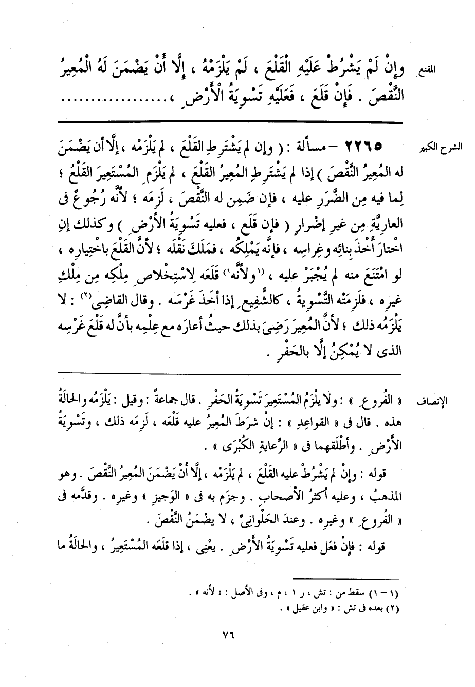 «الفُروعِ»: ولا يلْزَمُ المُسْتَعِيرَ تَسْويَةُ الحَفْرِ. قال جماعةٌ: وقيل: يَلْزَمُه والحالةُ هذه. قال في «القواعِدِ»: إنْ شرَطَ المُعِيرُ عليه قَلْعَه، لَزِمَه ذلك، وتَسْويَةُ الأرْضِ. وأطْلَقهما في «الرِّعايةِ الكُبْرَى».