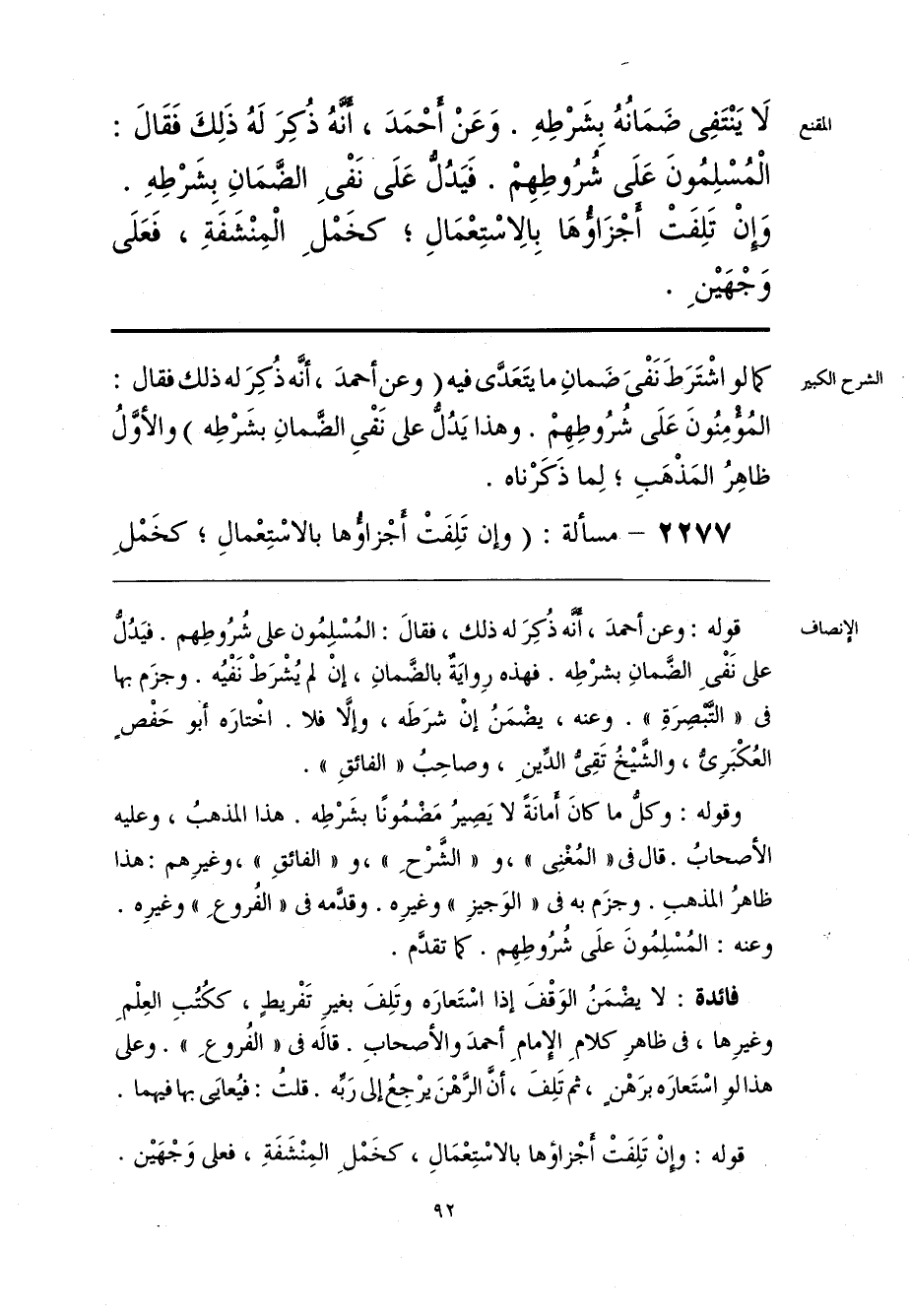 قوله: وعن أحمدَ، أنَّه ذُكِرَ له ذلك، فقال: المُسْلِمُون على شُرُوطِهم. فيَدُلُّ على نَفْي الضمانِ بشرْطِه. فهذه رِوايَةٌ بالضَّمانِ، إنْ لم يُشْرَطْ نَفيُه. وجزَم بها في «التبصِرَةِ». وعنه، يضْمَنُ إنْ شرَطَه، وإلَّا فلا. اخْتارَه أبو حَفْصٍ العُكْبَرِيُّ، والشَّيخُ تَقِيُّ الدِّينِ، وصاحِبُ «الفائقِ».