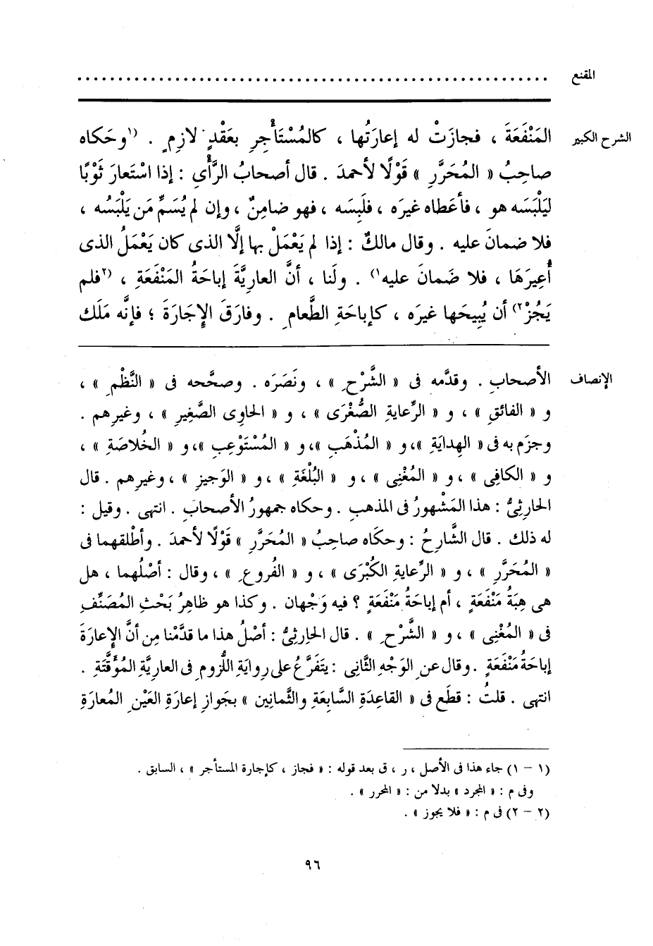 الأصحابِ. وقدَّمه في «الشَّرْحِ»، ونَصَرَه. وصحَّحه في «النَّظْمِ»، و «الفائقِ»، و «الرِّعايةِ الصُّغْرَى»، و «الحاوي الصَّغِيرِ»، وغيرِهم. وجزَم به في «الهِدايَةِ»، و «المُذْهَبِ»، و «المُسْتَوْعِبِ»، و «الخُلاصَةِ»، و «الكافِي»، و «المُغْنِي»، و «البُلْغَةِ»، و «الوَجيزِ»، وغيرِهم. قال الحارِثِيُّ: هذا المَشْهورُ في المذهبِ. وحكاه جمهورُ الأصحابِ. انتهى. وقيل: له ذلك. قال الشَّارِحُ: وحكَاه صاحِبُ «المُحَرَّرِ» قَوْلًا لأحمدَ. وأطْلقهما في «المُحَرَّرِ»، و «الرعايةِ الكُبْرَى»، و «الفُروعِ»، وقال: أصْلُهما، هل هي هِبَةُ مَنْفَعَةٍ، أم إباحَةُ مَنْفَعَةٍ؟ فيه وَجْهان. وكذا هو ظاهِرُ بَحْثِ المُصَنِّفِ في «المُغْنِي»، و «الشَّرْحِ». قال الحارثِيُّ: أصْلُ هذا ما قدَّمْنا مِن أنَّ الإِعارَةَ إباحَةُ مَنْفَعَةٍ. وقال عنِ الوَجْهِ الثَّانِي: يتَفَرَّعُ على رِوايَةِ اللُّزومِ في العارِيَّةِ المُؤقتَةِ. انتهى. قلتُ: قطَع في «القاعِدَةِ السَّابِعَةِ والثمانِين» بجَوازِ إعارَةِ العَينِ المُعارَةِ