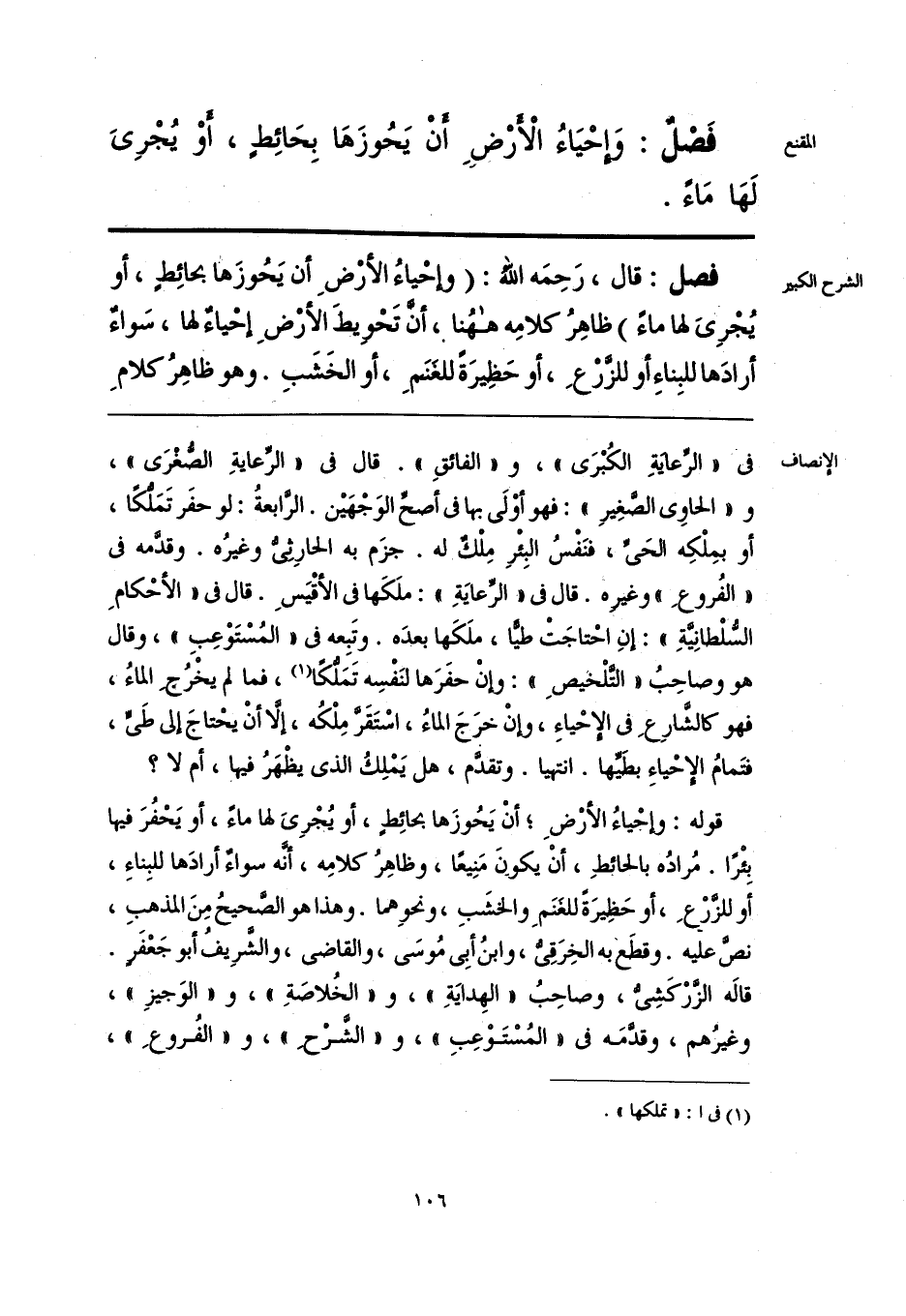 قوله: وإحْياءُ الأرْضِ؛ أنْ يَحُوزَها بحائِطٍ، أو يُجْرِيَ لها ماءً، أو يَحْفُرَ فيها بِئْرًا. مُرادُه بالحائطِ، أنْ يكونَ مَنِيعًا، وظاهِرُ كلامِه، أنَّه سواءٌ أرادَها للبِناءِ، أو للزَّرْعِ، أو حَظِيرَةً للغَنَمِ والخشَبِ، ونحوهما. وهذا هو الصَّحيحُ مِنَ المذهبِ، نصَّ عليه. وقطَع به الخِرَقِيُّ، وابنُ أبِي مُوسَى، والقاضي، والشَّرِيفُ أبو جَعْفَرٍ. قاله الزَّرْكَشِيُّ، وصاحِبُ «الهِدايَةِ»، و «الخُلاصَةِ»، و «الوَجيزِ»، وغيرُهم، وقدَّمَه في «المُسْتَوْعِبِ»، و «الشَّرْحِ»، و «الفُروعِ»،