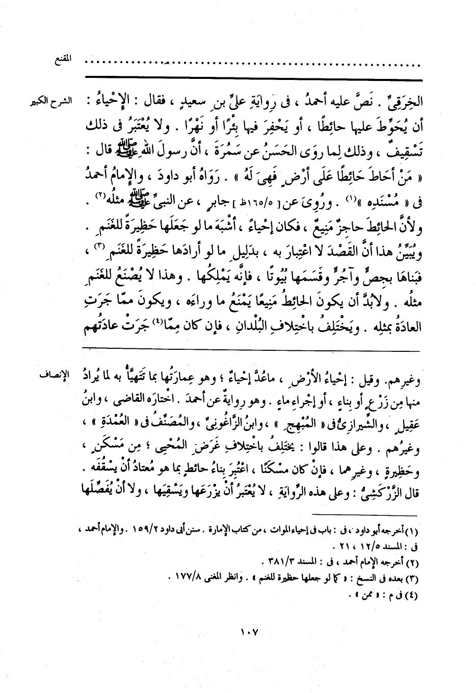 وغيرِهم. وقيل: إحْياءُ الأرْضِ، ما عُدَّ إحْياءٌ؛ وهو عِمارَتُها بما تَتَهيَّأُ به لما يُرادُ منها مِن زَرْعٍ أو بِناءٍ، أو إجْراءِ ماءٍ. وهو رِوايةٌ عن أحمدَ. اخْتارَه القاضي، وابنُ عَقِيلٍ، والشِّيرازِيُّ في «المُبْهِجِ»، وابنُ الزَّاغُونِيِّ، والمُصَنِّفُ في «العُمْدَةِ»، وغيرُهم. وعلى هذا قالوا: يختَلِفُ باخْتِلافِ غَرَضِ المُحْيِي؛ مِن مَسْكَنٍ، وحَظِيرةٍ، وغيرِهما، فإنْ كان مسْكَنًا، اعْتُبِرَ بِناءُ حائطٍ بما هو مُعتادُ أنْ يسْقُفَه. قال الزَّرْكَشِيُّ: وعلى هذه الرِّوايَةِ، لا يُعْتَبرُ أنْ يزْرَعَها ويَسْقِيَها، ولا أنْ يُفَصِّلَها