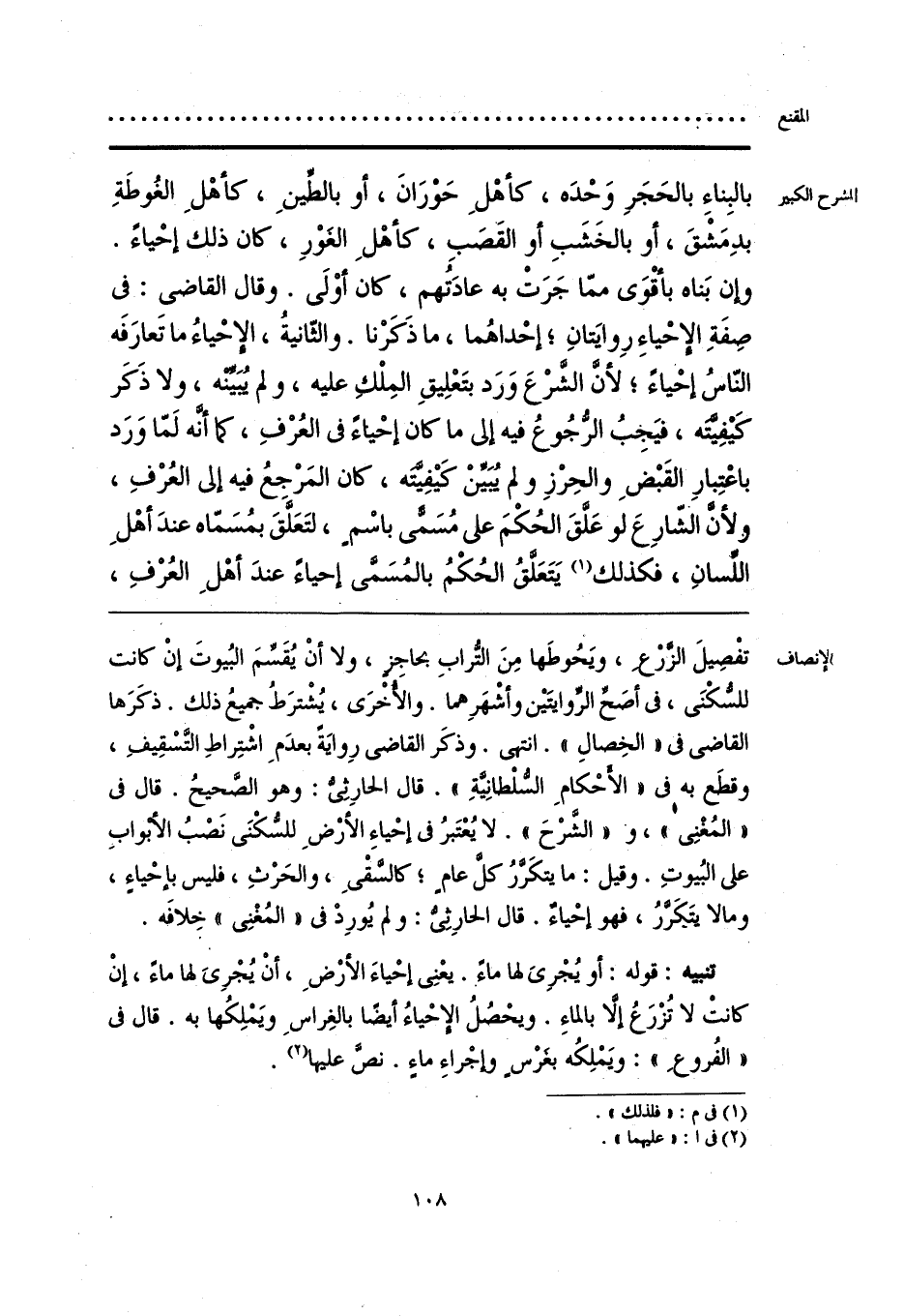 تفْصِيلَ الزَّرْعِ، ويَحُوطَها مِنَ التُّرابِ بحاجِزٍ، ولا أنْ يُقَسِّمَ البُيوتَ إنْ كانت للسُّكْنَى، في أصَحِّ الرِّوايتَين وأشْهَرِهما. والأُخْرَى، يُشْترَطُ جميعُ ذلك. ذكَرَها القاضي في «الخِصالِ». انتهى. وذكَر القاضي رِوايَةً بعدَمِ اشْتِراطِ التَّسْقِيفِ، وقطَع به في «الأَحْكامِ السُّلْطانِيَّةِ». قال الحارِثِيُّ: وهو الصَّحيحُ. قال في «المُغْنِي»، و «الشَّرْحَ». لا يُعْتَبرُ في إحْياءِ الأرْضِ للسُّكْنَى نَصْبُ الأبْوابِ على البُيوتِ. وقيل: ما يتكَرَّرُ كلَّ عامٍ؛ كالسَّقْي، والحَرْثِ، فليس بإحْياءٍ، وما لا يتَكَرَّرُ، فهو إحْياءٌ. قال الحارِثِيُّ: ولم يُورِدْ في «المُغْنِي» خِلافَه.