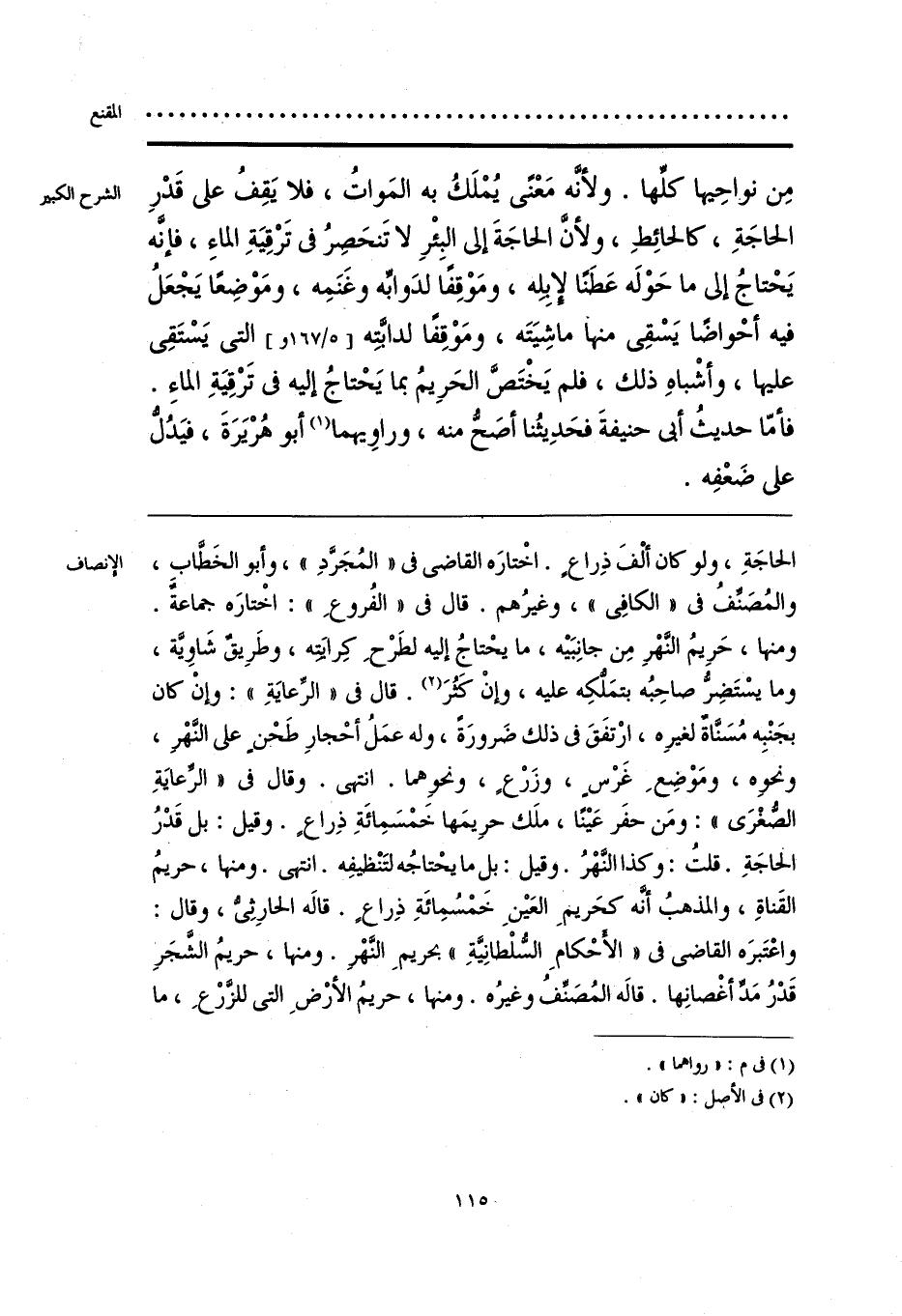 الحاجَةِ، ولو كان ألْفَ ذِراعٍ. اخْتارَه القاضي في «المُجَرَّدِ»، وأبو الخَطَّابِ، والمُصَنِّفُ في «الكافِي»، وغيرُهم. قال في «الفُروعِ»: اخْتارَه جماعةٌ. ومنها، حَرِيمُ النَّهْرِ مِن جانِبَيه، ما يحْتاجُ إليه لطَرْحِ كِرايَتِه، وطَرِيقٌ شَاويَّة، وما يسْتَضِرُّ صاحِبُه بتمَلُّكِه عليه، وإنْ كَثُرَ (¬1). قال في «الرِّعايَةِ»: وإنْ كان بجَنْبِه مُسَنَّاةٌ لغيرِه، ارْتفَقَ في ذلك ضَرورَةً، وله عمَلُ أحْجارِ طَحْنٍ على النَّهْرِ، ونحوه، ومَوْضِعِ غَرْسٍ، وزَرْعٍ، ونحوهما. انتهى. وقال في «الرِّعايَةِ الصُّغْرَى»: ومَن حفَر عَينًا، ملَك حرِيمَها خَمْسَمِائَةِ ذِراعٍ. وقيل: بل قَدْرُ الحاجَةِ. قلتُ: وكذا النَّهْرُ. وقيل: بل ما يحْتاجُه لتَنْظيفِه. انتهى. ومنها، حريمُ القَناةِ، والمذهبُ أنَّه كحَريمِ العَينِ خَمْسُمِائَةِ ذِراعٍ. قاله الحارِثِيُّ، وقال: واعْتَبرَه القاضي في «الأَحْكامِ السُّلْطانِيَّةِ» بحريمِ النَّهْرِ. ومنها، حريمُ الشَّجَرِ قَدْرُ مَدِّ أغْصانِها. قاله المُصَنِّفُ وغيرُه. ومنها، حريمُ الأرْضِ التي للزَّرْعِ، ما