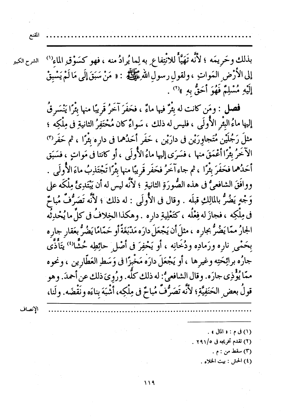 فصل: ومَن كانت له بِئْرٌ فيها ماءٌ، فحَفَرَ آخَرُ قَرِيبًا منها بِئْرًا يَنْسَرِقُ إليها ماءُ البِئْرِ الأُولَى، فليس له ذلك، سَواءٌ كان مُحْتَفِرُ الثانيةِ في مِلْكِه؛ مثلَ رَجُلَين مُتَجاورَين في دارَين، حَفَر أحَدُهما في دارِه بِئْرًا، ثمَّ حَفَر (¬3) الآخَرُ بِئْرًا أعْمَقَ منها، فسَرَى إليها ماءُ الأُولَى، أو كانتا في مَواتٍ، فسَبَق أحَدُهما فحَفَرَ بِئْرًا، ثمَّ جاء آخَرُ فحَفَر قَرِيبًا منها بِئْرًا تَجْتَذِبُ ماءَ الأُولَى. ووافَقَ الشافعيُّ في هذه الصُّورَةِ الثانيةِ؛ لأنَّه ليس له أن يَبْتَدِئَ مِلْكَه على وَجْهٍ يَضُرُّ بالمالِكِ قبلَه. وقال في الأُولَى: له ذلك؛ لأنَّه تَصَرُّفٌ مُباحٌ في مِلْكِه، فجازَ له فِعْلُه، كتَعْلِيةِ دارِه. وهكذا الخِلافُ في كلِّ ما يُحْدِثُه الجارُ ممَّا يَضُرُّ بجارِه، مثلَ أن يَجْعَلَ دارَه مَدْبَغَةً أو حَمّامًا يَضُرُّ بعَقارِ جارِه بِحَمْي نارِه ورَمادِه ودُخَانِه، أو يَحْفِرَ في أصْلِ حائِطِه حُشًّا (¬4) يتَأَذَّى جارُه برائِحَتِه وغيرِها، أو يَجْعَلَ دارَه مَخْبِزًا في وَسَطِ العَطّارِين، ونحوه ممَّا يُؤْذِي جارَه. وقال الشافعيُّ: له ذلك كلُّه. ورُوِيَ ذلك عن أحمدَ. وهو قولُ بعضِ الحَنَفِيَّةِ؛ لأنَّه تَصَرُّفٌ مُباحٌ في مِلْكِه، أشْبَهَ بِناءَه ونَقْضَه. ولَنا،