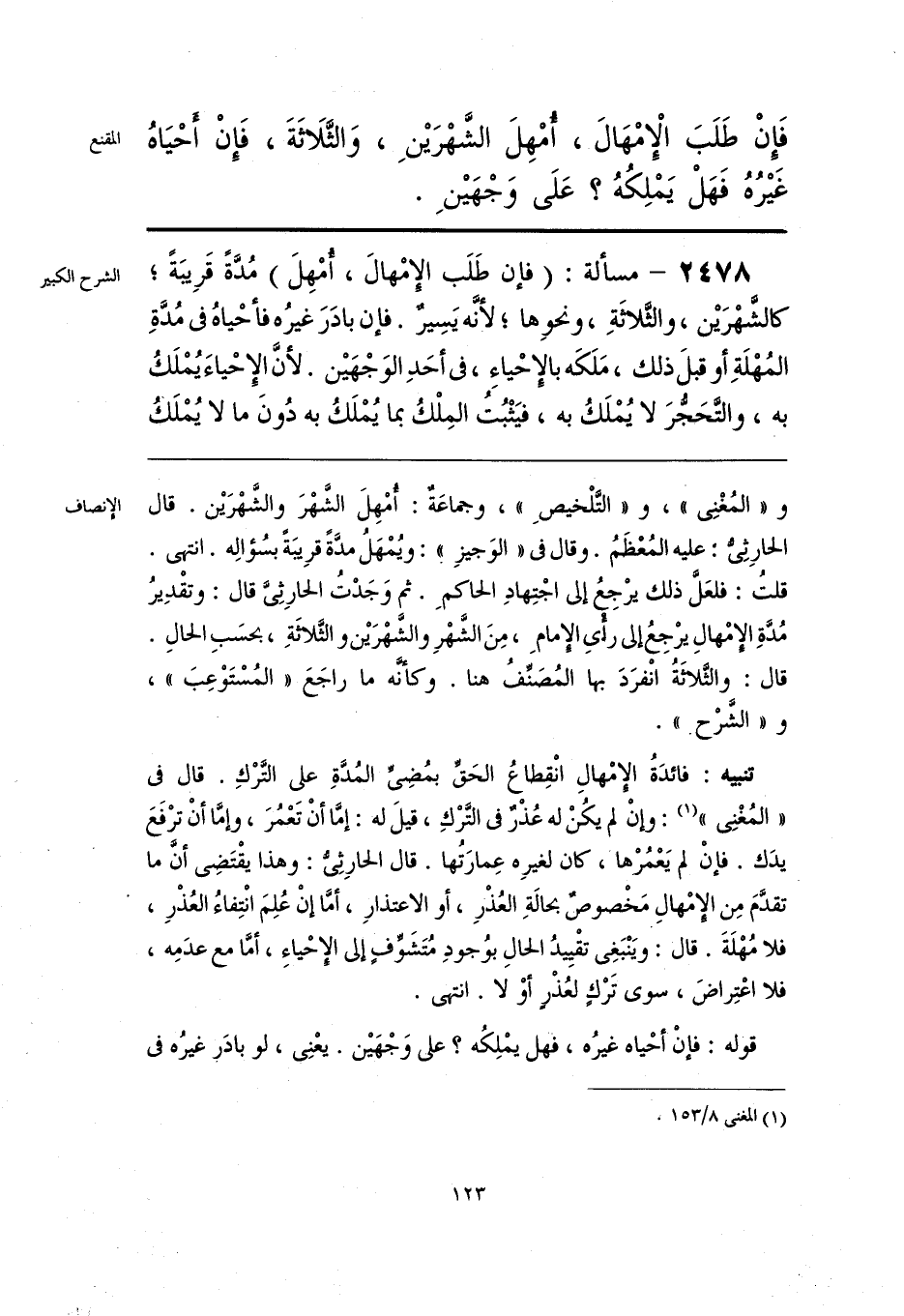 تنبيه: فائدَةُ الإِمْهالِ انْقِطاعُ الحَقِّ بمُضِيِّ المُدَّةِ على التَّرْكِ. قال في «المُغْنِي» (¬1): وإنْ لم يكُنْ له عُذْرٌ في التَّرْكِ، قيلَ له: إمَّا أنْ تَعْمُرَ، وإمَّا أنْ ترْفَعَ يدَك. فإنْ لم يَعْمُرْها، كان لغيرِه عِمارَتُها. قال الحارِثِيُّ: وهذا يقْتَضِي أنَّ ما تقدَّمَ مِن الإِمْهالِ مَخْصوصٌ بحالةِ العُذْرِ، أو الاعتذارِ، أمَّا إنْ عُلِمَ انْتِفاءُ العُذْرِ، فلا مُهْلَةَ. قال: ويَنْبَغِي تقْيِيدُ الحالِ بوُجودِ مُتَشَوِّفٍ إلى الإِحْياءِ، أمَّا مع عدَمِه، فلا اعْتِراضَ، سوى تَرْكٍ لعُذْرٍ أوْ لا. انتهى.