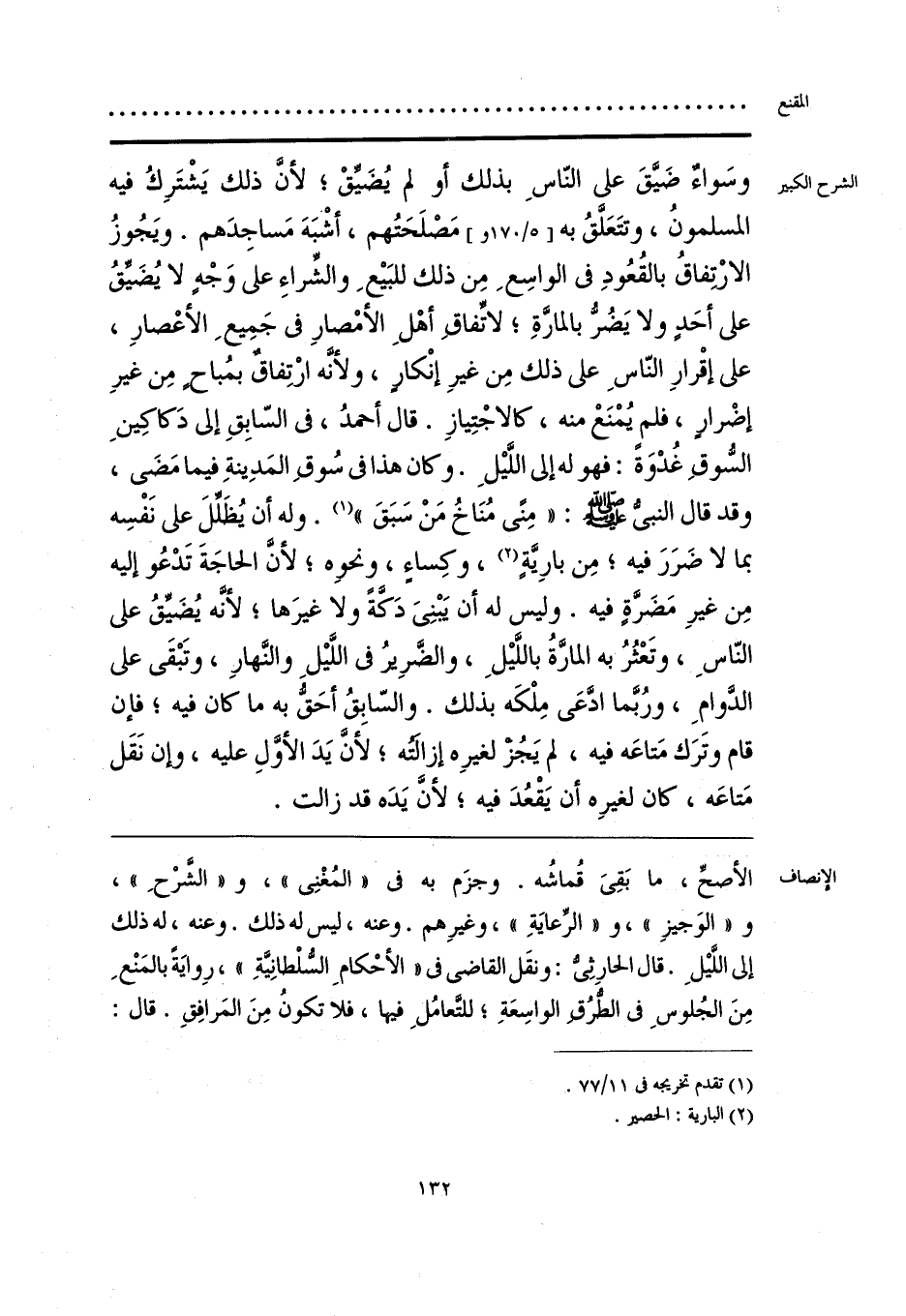 الأصحِّ، ما بَقِيَ قُماشُه. وجزَم به في «المُغْنِي»، و «الشَّرْحِ»، و «الوَجيزِ»، و «الرِّعايَةِ»، وغيرِهم. وعنه، ليس له ذلك. وعنه، له ذلك إلى اللَّيلِ. قال الحارِثِيُّ: ونقَل القاضي في «الأحْكامِ السُّلْطانِيَّةِ»، رِوايَةً بالمَنْعِ مِنَ الجُلوسِ في الطُّرُقِ الواسِعَةِ؛ للتَّعامُلِ فيها، فلا تكونُ مِنَ المَرافِقِ. قال: