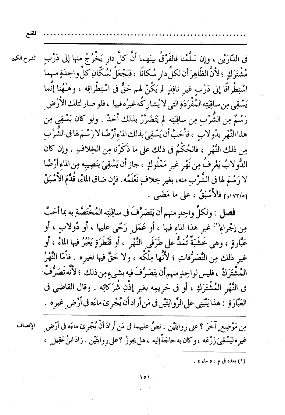 مِن مَوْضِعٍ آخَرَ؟ على رِوايتَين. نصَّ عليهما في مَن أرادَ أنْ يُجْرِيَ ماءَه في أرْضِ غيرِه ليَسْقِيَ زَرْعَه، وكان به حاجَةٌ إليه، كل يجوزُ؟ على رِوايتَين. زادَ ابنُ عَقِيلٍ،