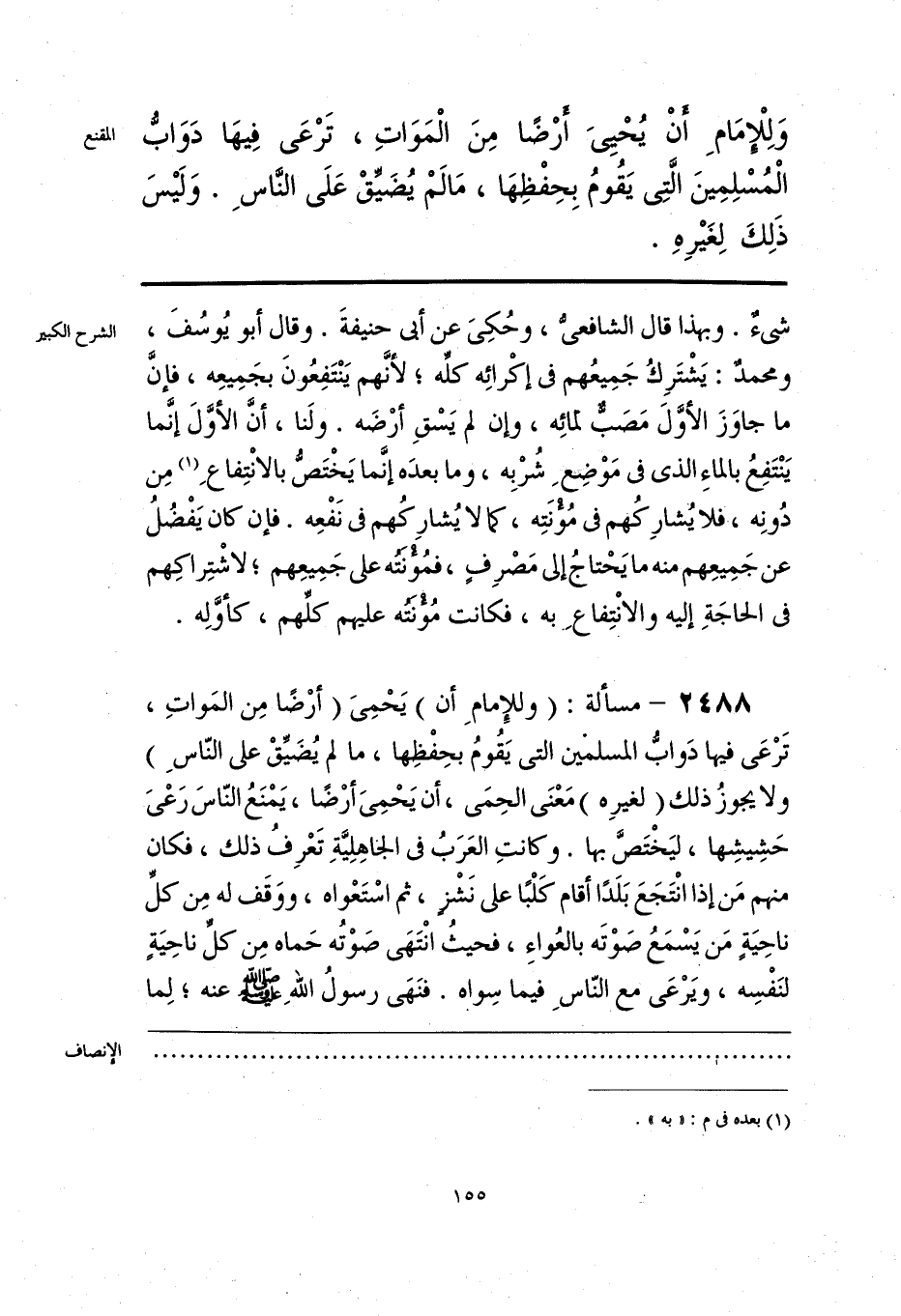 وَلِلامَامِ أنْ يُحْييَ أرْضًا مِنَ الْمَوَاتِ، تَرْعَى فِيهَا دَوَابُّ الْمُسْلِمِينَ الَّتِي يَقُومُ بِحِفْظِهَا، مَا لمْ يُضَيِّقْ عَلَى النَّاسِ. وَلَيس ذَلِكَ لِغَيرِهِ.
