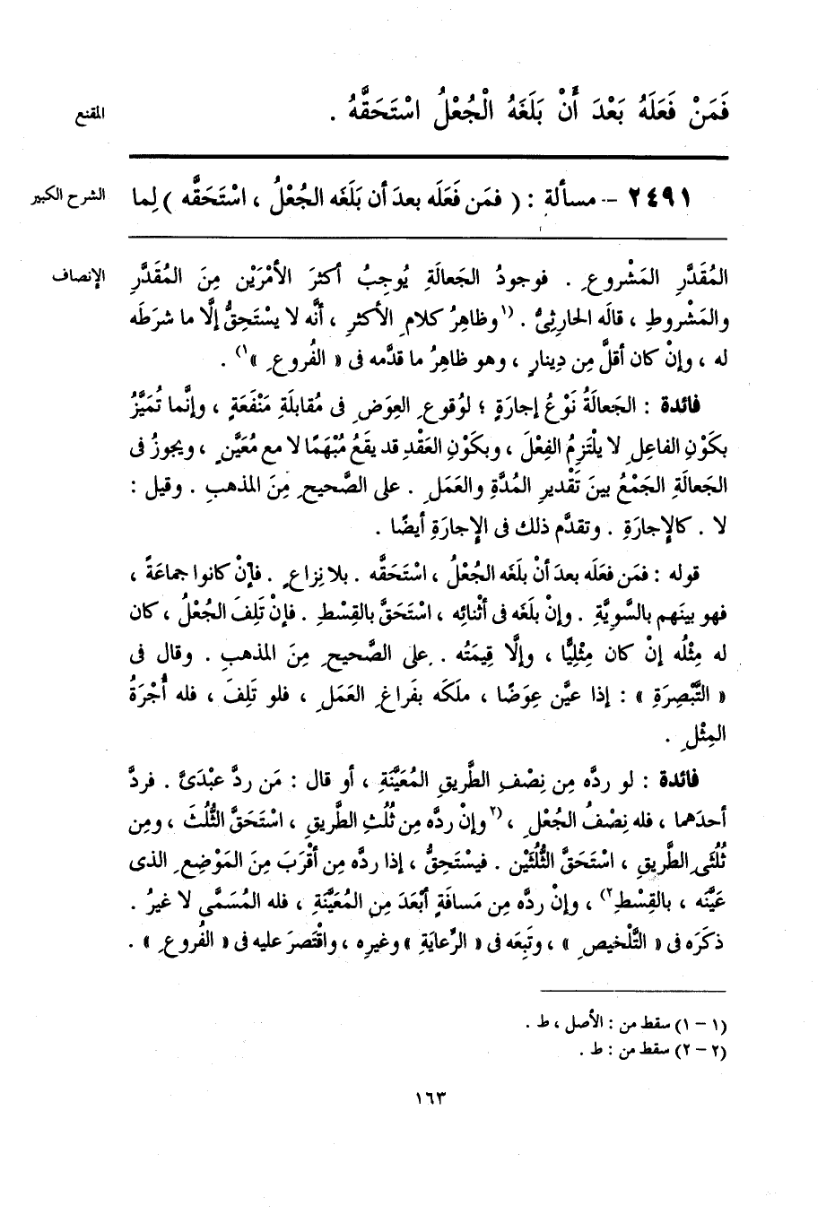 فائدة: لو ردَّه مِن نِصْف الطَّريقِ المُعَينةِ، أو قال: مَن ردَّ عبْدَيَّ. فردَّ أحدَهما، فله نِصفُ الجُعْلِ، [وإنْ ردَّه مِن ثُلُثِ الطَّريقِ، اسْتَحَقَّ الثلُثَ، ومِن ثُلُثَي الطريقِ، اسْتَحَقَّ الثُّلُثَين. فيسْتَحِق، إذا رده مِن أقْرَبَ مِنَ المَوْضِعِ الذي عَيَّنه، بالقِسْطِ] (¬2)، وإنْ رده مِن مَسافَة أبعَدَ مِن المُعَينةِ، فله المُسَمَّى لا غيرُ. ذكَرَه في «التَّلْخيصِ»، وتَبِعَه في «الرعايَةِ» وغيرِه، واقتصرَ عليه في «الفُروعِ».