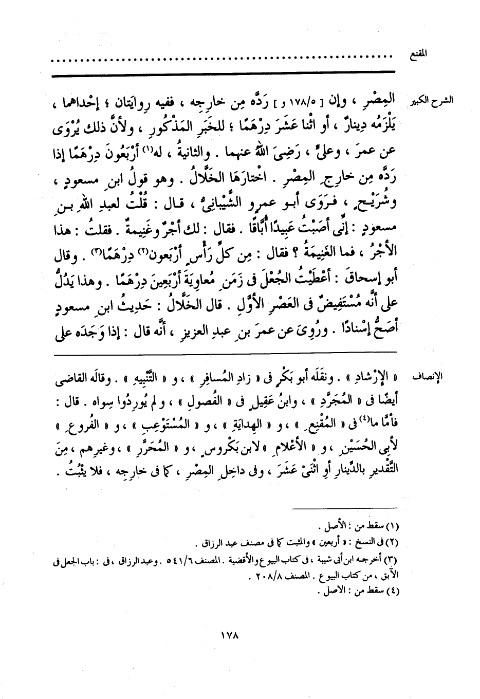 «الإرْشادِ». ونقَلَه أبو بَكْر في «زادِ المُسافِرِ»، و «التنبِيهِ». وقاله القاضي أيضًا في «المُجَردِ»، وابنُ عَقِيل في «الفُصولِ»، ولم يُورِدُوا سِواه. قال: فأما ما (¬1) في «المُقْنِعِ»، و «الهِدايَةِ»، و «المُسْتَوْعِبِ»، و «الفُروعِ» لأبِي الحُسَينِ، و «الأعْلامِ» لابن بَكْروس، و «المُحَررِ»، وغيرِهم، مِنَ التقْديرِ بالدينارِ أو اثْنَي عَشَرَ، وفي داخِلِ المِصْرِ، كما في خارِجِه، فلا يثْبُتُ.