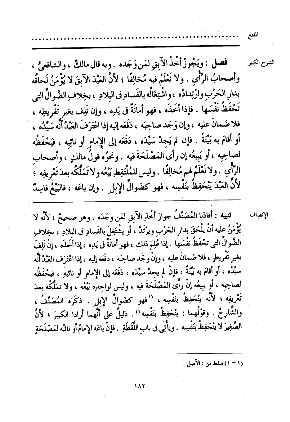 تنبيه: أفادَنا المُصَنِّف جوازَ أخذِ الآبِقِ لمن وجَدَه. وهو صحيحٌ؛ لأنه لا يُؤْمَنُ عليه أنْ يلْحقَ بدارِ الحَرْبِ ويرْتَد، أو يشْتَغِل بالفَسادِ في البلادِ، بخِلافِ الضوالِّ التي تحْفَظُ نفْسَها. إذا عُلِمَ ذلك، فهو أمانة في يَدِه، إذا أَخَذَه، إنْ تَلِفَ بغيرِ تَفْريطٍ، فلا ضَمانَ عليه، وانْ وجَد صاحِبَه، دفَعَه إليه، إذا اعْتَرف العَبْدُ أنه سيِّدُه، أو أقامَ به بَيِّنةً، فإنْ لم يجِدْ سيِّدَه، دَفَعَه إلى الامامِ أو نائبهِ، فيحْفَظُه لصاحِبِه، أو بيعُه إنْ رأى المَصْلَحَةَ فيه، وليس لواجِدِه بَيعُه، ولا تمَلكُه بعدَ تَعْريفِه؛ لأنه ينْحَفِظُ بنَفْسِه، [فهو كضَوالِّ الإبلِ. ذكَرَه المُصنِّفُ، والشارِحُ. وقوْلُهما: ينْحَفِظُ بنَفْسِه] (¬1). دَليل على أنهما أرادا الكبيرَ؛ لأن الصغِيرَ لا ينْحَفِظُ بنَفْسِه. ويأتِي في بابِ اللقَطَةِ. فإنْ باعَه الامامُ أو نائبُه لمَصْلَحَةٍ