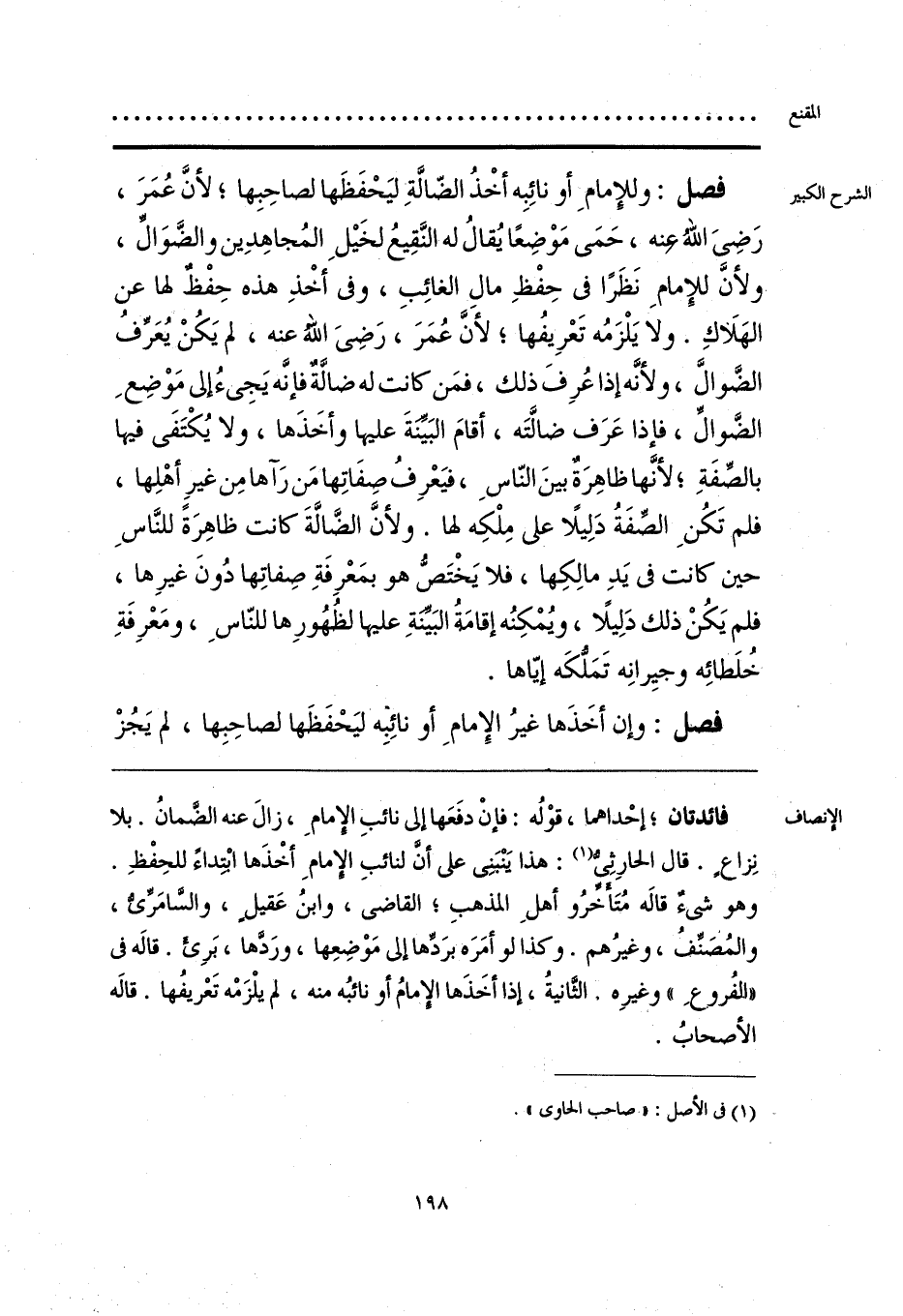 فائدتان؛ إحْداهما، قوْلُه: فإنْ دفَعَها إلى نائبِ الإمامِ، زال عنه الضمانُ. بلا نِزاعٍ. قال الحارِثِي (¬1): هذا يَنْبَنِي على أن لنائبِ الإمامِ أخْذَها ابتداءً للحِفْظِ. وهو شيء قاله مُتَأخرُو أهلِ المذهبِ؛ القاضي، وابنُ عَقيل، والسامَرِّي، والمُصَنِّف، وغيرُهم. وكذا لو أمَرَه برَدِّها إلى مَوْضِعِها، ورَدها، بَرِئ. قاله في «الفُروع» وغيرِه. الثَّانيةُ، إذا أخَذَها الإمامُ أو نائبُه منه، لم يلْزَمْه تَعْريفُها. قاله الأصحابُ.
