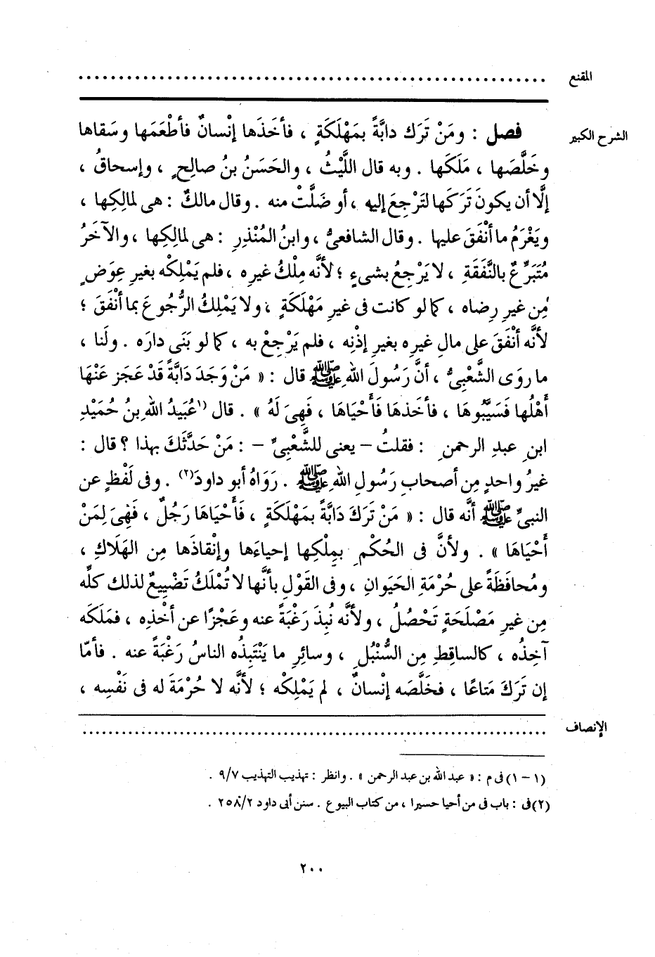 فصل: ومَنْ ترك دابَّةً بمَهْلَكَةٍ، فأخَذَها إنْسان فأطْعَمَها وسَقاها وخَلصَها، مَلَكَها. وبه قال اللَّيثُ، والحَسَنُ بنُ صالِح، وإسحاقُ، إلَّا أن يكونَ تَرَكَها لتَرْجِعَ إليه، أو ضَلَّتْ منه. وقال مالك: هي لمالِكِها، ويَغْرَمُ ما أنْفَقَ عليها. وقال الشافعيُّ، وابنُ المُنْذِرِ: هي لمالِكِها، والآخَرُ مُتَبَرِّع بالنَّفَقَةِ، لا يَرْجِعُ بشيءٍ؛ لأنَّه مِلْكُ غيرِه، فلم يَمْلِكْه بغيرِ عِوَض مِن غيرِ رِضاه، كما لو كانت في غيرِ مَهْلَكَةٍ، ولا يَمْلِكُ الرُّجُوعَ بما أنْفَقَ، لأنَّه أنْفَقَ على مالِ غيرِه بغيرِ إذْنِه، فلم يَرجعْ به، كما لو بَنَى دارَه. ولَنا، ما روَى الشّعْبِيُّ، أنَّ رَسُولَ اللهِ - صلى الله عليه وسلم - قال: «مَنْ وَجَدَ دَابَّةً قَدْ عَجَز عَنْهَا أهلُها فَسَيبوهَا، فأخَذهَا فَأحيَاهَا، فَهِيَ لَهُ». قال [عُبَيد اللهِ بنُ حُمَيدِ بنِ عبدِ الرحمنِ] (¬1): فقلتُ -يعني للشَّعْبِيِّ-: مَنْ حَدَّثَكَ بهذا؟ قال: غيرُ واحدٍ مِن أصحابِ رَسُولِ اللهِ - صلى الله عليه وسلم -. رَوَاهُ أبو داودَ (¬2). وفي لَفْظٍ عن النبيِّ - صلى الله عليه وسلم - أنَّه قال: «مَنْ تَرَكَ دَابَّةً بمَهْلَكَة، فَأحيَاهَا رَجُل، فَهيَ لِمَنْ أحْيَاهَا». ولأنَّ في الحُكْمِ بملْكِها إحياءَها وإنْقاذَها مِن الهَلَاكِ، ومُحافَظَةً على حُرْمَةِ الحَيَوانِ، وفي القَوْلِ بأنَّها لا تُمْلَكُ تَضْيِيعٌ لذلك كلِّه مِن غيرِ مَصْلَحَةٍ تَحْصُلُ، ولأنه نُبِذَ رَغْبَةً عنه وعَجْزًا عن أخْذِه، فمَلَكَه آخِذُه، كالساقِطِ مِن السُّنْبُلِ، وسائِرِ ما يَنْتَبِذُه الناسُ رَغْبَةً عنه. فأمّا إن تَرَكَ مَتاعًا، فخَلَّصَه إنْسان، لم يَمْلِكْه؛ لأنَّه لا حُرْمَةَ له في نَفْسِه،