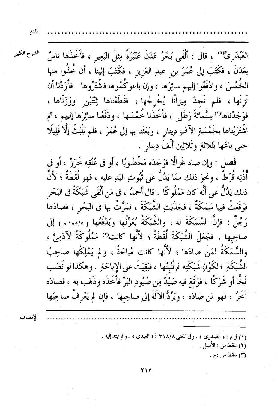 فصل: وإن صاد غَزالًا فوَجَدَه مَخْضُوبًا، أو في عُنُقِه خَرَزٌ، أو في أذُنِه قُرْط، ونحوَ ذلك ممّا يَدُلُّ على ثُبُوتِ اليَدِ عليه، فهو لُقَطَة؛ لأنَّ ذلك يَدُلُّ على أنَّه كان مَمْلُوكًا. قال أحمدُ، في مَن ألْقَى شَبَكَةً في البَحْرِ فوَقَعَتْ فيها سَمَكَةٌ، فجَذَبَتِ الشَّبَكَةَ، فمَرَّت بها في البَحْرِ، فصادَها رَجُلٌ: فإنَّ السَّمَكَةَ له، والشَّبَبهَةُ يُعَرِّفُها ويَدْفَعُها إلى صاحِبِها. فجَعَلَ الشَّبَكَةَ لُقَطَةً؛ لأنَّها كانت (¬3) مَمْلُوكَةً لآدَمِي، والسَّمَكَةُ لمَن صادَها؛ لأنَّها كانت مُباحَةً، ولم يَمْلِكْها صاحِبُ الشَّبَكَةِ؛ لكَوْنِ شَبَكَتِه لم تُثْبِتْها، فبَقِيَتْ على الإِباحةِ. وهكذا لو نَصَب فَخًّا أو شرَكًا، فوَقَعَ فيه صَيدٌ مِن صُيُودِ البَرِّ فأخَذَه وذَهَب به، فصادَه آخَرُ، فهو لمن صادَه، ويَرُدُّ الآلةَ إلى صاحِبِها، فإن لم يَعْرِفْ صاحِبَها