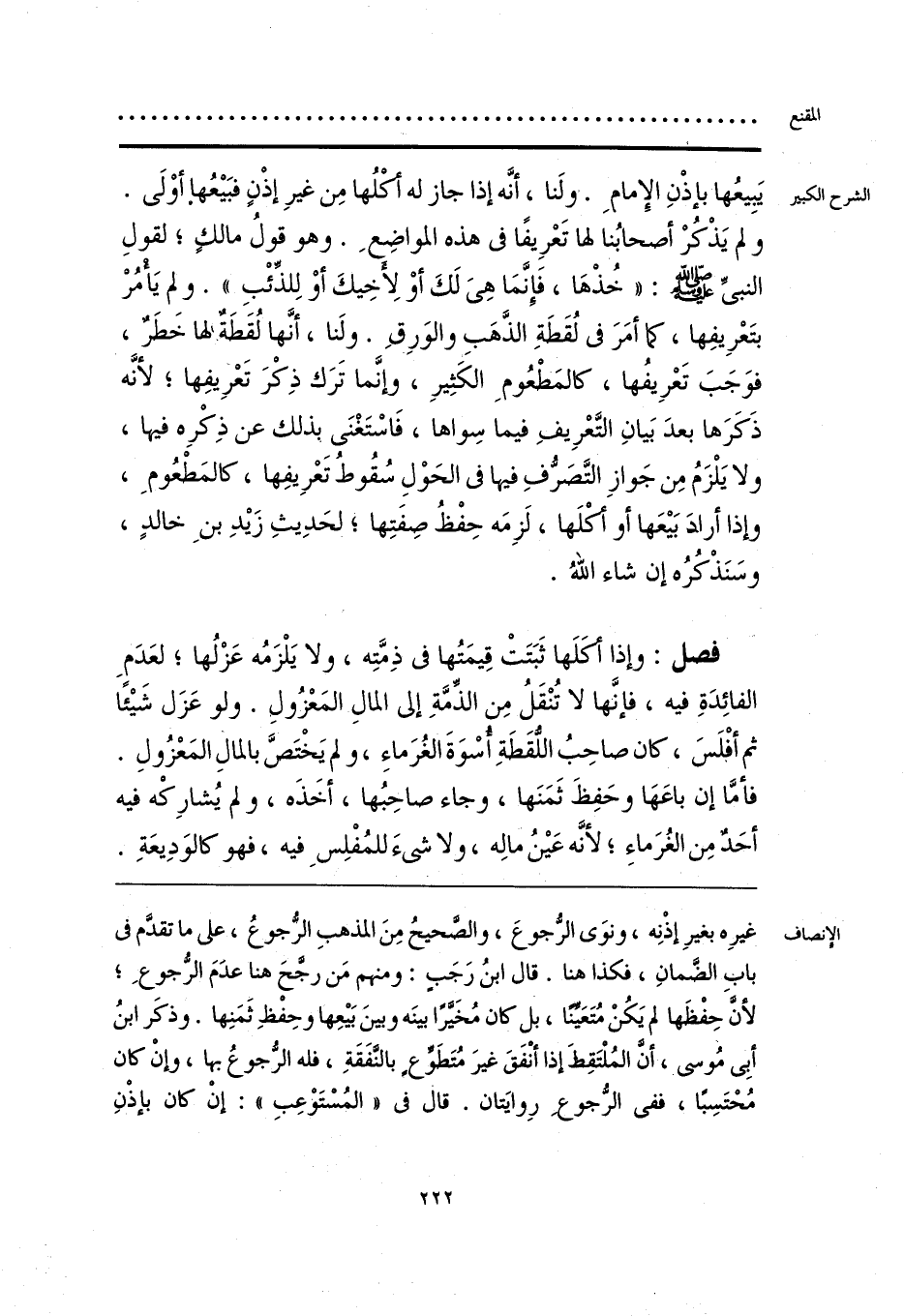 غيرِه بغيرِ إذْنِه، ونوَى الرُّجوعَ، والصَّحيحُ مِنَ المذهبِ الرُّجوعُ، على ما تقدم في بابِ الضمانِ، فكذا هنا. قال ابنُ رَجَبٍ: ومنهم مَن رجَّحَ هنا عدَمَ الرُّجوعِ؛ لأنَّ حِفْظَها لم يَكُنْ مُتَعَيِّنًا، بل كان مُخَيَّرًا بينَه وبينَ بَيعِها وحِفْظِ ثَمَنِها. وذكَر ابنُ أبِي مُوسى، أن المُلْتَقِطَ إذا أنْفَقَ غيرَ مُتَطَوِّع بالنَّفَقَةِ، فله الرُّجوعُ بها، وإنْ كان مُحتَسبًا، ففي الرُّجوع رِوايَتان. قال في «المُسْتَوْعِبِ»: إنْ كان بإذْنِ