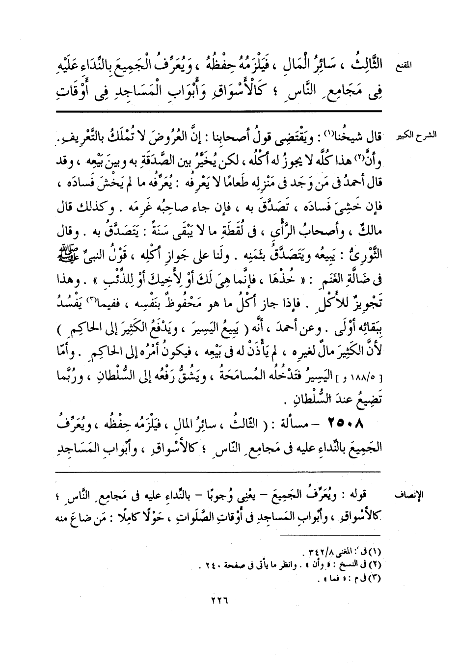 الثَّالِثُ، سَائِرُ الْمَالِ، فَيَلْزَمُهُ حِفْظُهُ، وَيُعَرِّف الْجَمِيعَ بِالنِّدَاءِ عَلَيهِ فِي مَجَامِعِ النَّاسِ؛ كَالْأَسْوَاقِ وَأبْوَابِ الْمَسَاجِدِ فِي أوْقَاتِ