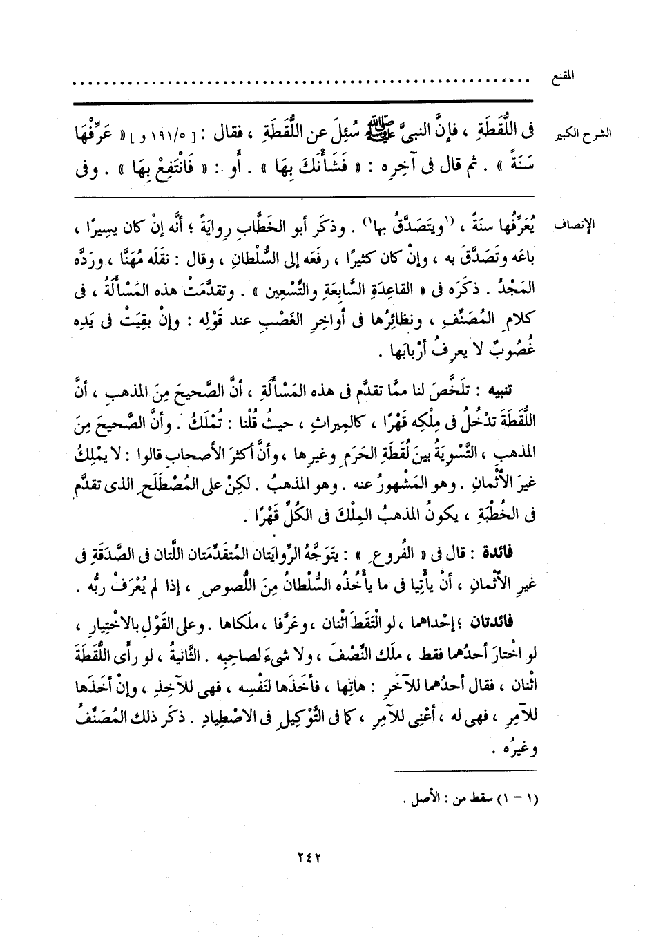 تنبيه: تلَخَّصَ لنا ممَّا تقدَّم في هذه المَسْالةِ، أنَّ الصَّحيح مِنَ المذهبِ، أنَّ اللقَطَةَ تدخُلُ في مِلْكِه قَهْرًا، كالمِيراثِ، حيثُ قُلْنا: تُملَكُ. وأنَّ الصَّحيحَ مِنَ المذهبِ، التسْويَةُ بينَ لُقَطَةِ الحَرَمِ وغيرِها، وأنَّ أكثرَ الأصحابِ قالوا: لا يملِكُ غيرَ الأثْمانِ. وهو المَشْهورُ عنه. وهو المذهبُ. لكِنْ على المُصطَلَحِ الذي تقدَّم في الخُطبةِ، يكونُ المذهبُ المِلْكَ في الكُلِّ قهْرًا.