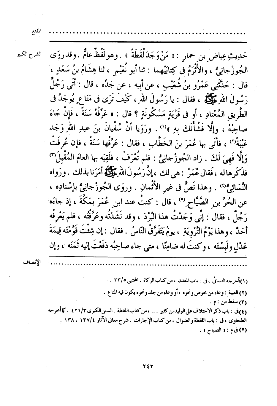 حَدِيثِ عِياضِ بنِ حمارٍ: «مَنْ وَجَدَ لُقَطَةً». وهو لَفْط عام. وقد روَى الجُوزْجانيُّ، والأثْرَمُ في كِتابَيهما: ثنا أبو نُعَيم، ثنا هِشَامُ بنُ سعدٍ، قال: حَدَّثَنِي عَمْرُو بنُ شُعَيبٍ، عن أبِيه، عن جَدِّه، قال: أتَى رَجل رَسُولَ اللهِ - صلى الله عليه وسلم -، فقال: يا رَسُولَ اللهِ، كَيفَ تَرَى في مَتَاع يُوجَدُ في الطَرِيقِ المُعتادِ، أو في قَريَةٍ مَسْكُونَةٍ؟ قال: «عَرِّفْهُ سَنَة، فَإنْ جَاءَ صاحِبُهُ، وإلَّا فَشْأنَكَ بِهِ» (¬1). ورَوَيا أنَّ سُفْيانَ بنَ عبدِ اللهِ وَجَد عَيبَةً (¬2)، فأتَى بها عُمَرَ بنَ الخَطَّابِ، فقال: عَرِّفْها سَنَةً، فإن عُرِفَتْ وَإلَّا فَهِيَ لَكَ. زاد الجُوزْجانِيُّ: فلم تُعرَفْ، فلَقِيَه بها العامَ المُقْبِلَ (¬3) فذَكَرها له، فقال عُمَرُ: هي لك، إنَّ رَسُولَ الله - صلى الله عليه وسلم - أمَرَنا بذلك. ورَواه النسَائِي (¬4). وهذا نَصُّ في غيرِ الأثْمانِ. وروَى الجُوزْجانِيُّ بإسْنادِه، عن الحُرِّ بنِ الصَّيَّاحِ (¬5)، قال: كنتُ عند ابنِ عُمَرَ بمَكَّةَ، إذ جاءَه رَجُلٌ، فقال: إنِّي وَجَدتُ هذا البُردَ، وقد نَشَدتُه وعَرَّفْتُه، فلم يَعرِفْه أحَدٌ، وهذا يَوْمُ الترويَةِ، يوم يَتَفَرَّقُ النّاسُ. فقال: إن شِئْتَ قَوَّمتَه قِيمَةَ عَدْلٍ ولَبِسْتَه، وكنتَ له ضامِنًا، متى جاء صاحِبُه دَفَعتَ إليه ثَمَنَه، وإن