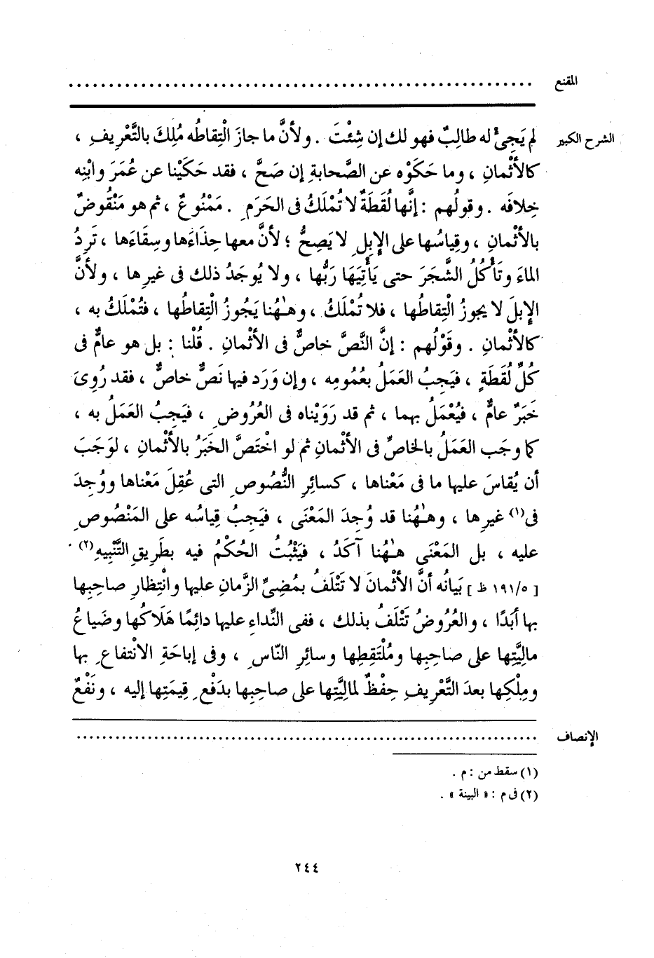 لم يَجِيء له طالِب فهو لك إن شِئْتَ. ولأنّ ما جازَ الْتِقاطُه مُلِكَ بالتَّعرِيفِ، كالأثْمانِ، وما حَكَوه عن الصحابةِ إن صَحَّ، فقد حَكَينا عن عُمَرَ وابْنِه خِلافَه. وقولُهم: إنَّها لُقَطَة لا تُملَكُ في الحَرَمِ. مَمنُوعٌ، ثم هو مَنْقُوض بالأثْمانِ، وقِياسُها على الإبِلِ لا يَصِحُّ؛ لأنَّ معها حِذَاءَها وسِقَاءَها، تَرِدُ الماءَ وتأكلُ الشَّجَرَ حتى يَأتِيها رَبُّها، ولا يُوجَدُ ذلك في غيرِها، ولأنَّ الإبلَ لا يجوزُ الْتِقاطُها، فلا تُملَكُ، وههُنا يَجُوزُ الْتِقاطُها، فتملَكُ به، كالأثْمانِ. وقَوْلُهم: إنَّ النَّصَّ خاصٌّ في الأثْمانِ. قُلْنا بل هو عام في كُلِّ لُقَطَةٍ، فيَجِبُ العَمَلُ بعُمُومِه، كان وَرَد فيها نَصّ خاص، فقد رُوِيَ خَبَر عام، فيُعمَلُ بهما، ثم قد رَوَيناه في العُرُوضِ، فيَجبُ العَمَلُ به، كما وجَب العَمَلُ بالخاصِّ في الأثْمانِ ثم لو اخْتَصَّ الخَبَرُ بالأثْمانِ، لوَجَبَ أن يُقاسَ عليها ما في مَعناها، كسائِرِ النُّصُوصِ التي عُقِلَ مَعناها ووُجِدَ في (¬1) غيرِها، وههُنا قد وُجدَ المعنَى، فيَجِبُ قِياسُه على المَنْصُوصِ عليه، بل المَعنَى ههُنا آكَدُ، فيَثْبُتُ الحُكْمُ فيه بطَرِيقِ التنبِيهِ (¬2) بَيانُه أنَّ الأثْمانَ لا تَتْلَفُ بمُضِيِّ الزَّمانِ عليها وانْتِظارِ صاحِبِها بها أبدًا، والعُرُوضُ تَتْلَفُ بذلك، ففي النِّداءِ عليها دائِمًا هلَاكُها وضَياعُ مالِيَّتها على صاحِبِها ومُلْتَقِطِها وسائِرِ النّاسِ، وفي إباحَةِ الانْتفاعِ بها ومِلْكِها بعدَ التَّعرِيفِ حِفْظ لمالِيَّتها على صاحِبِها بدَفْعِ قِيمَتِها إليه، ونَفْعٌ