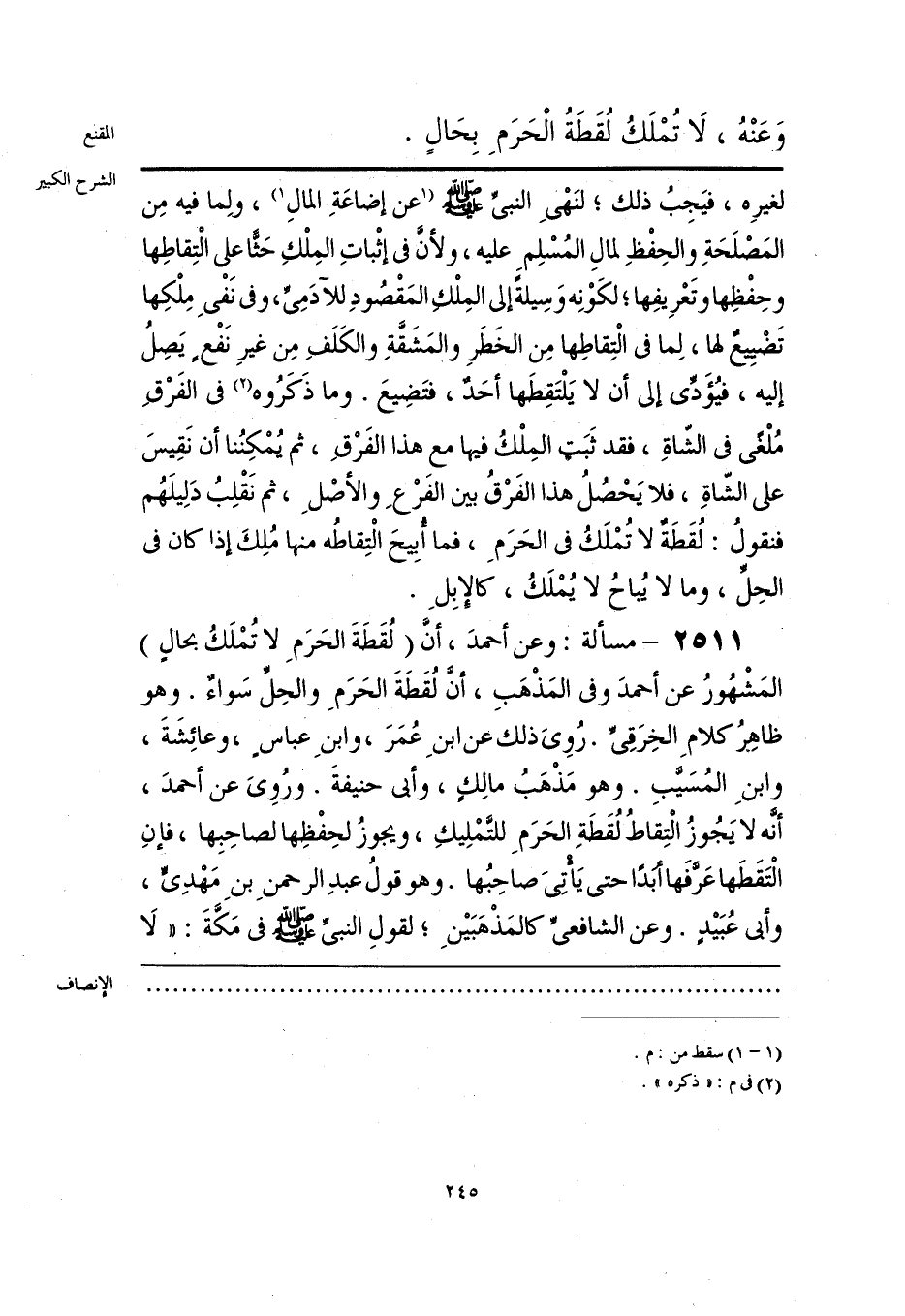وَعَنْهُ، لَا تُمْلَكُ لُقَطَةُ الْحَرَمِ بِحَالٍ.