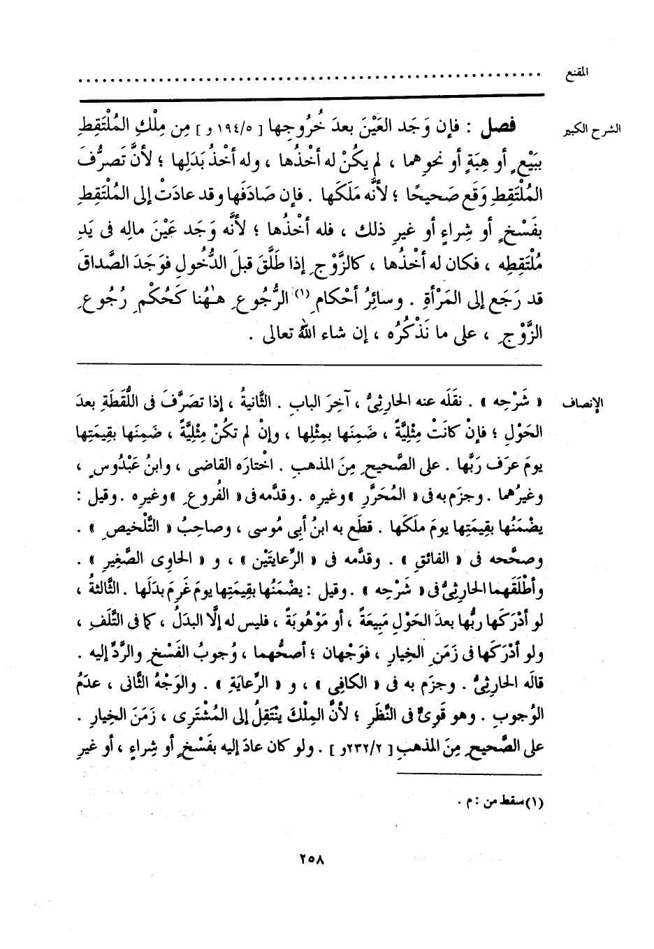 «شَرْحِه». نقَلَه عنه الحارِثِيُّ، آخِرَ البابِ. الثَّانيةُ، إذا تصَرَّفَ في اللُّقَطَةِ بعدَ الحَولِ؛ فإنْ كانَتْ مِثْليَّةً، ضَمِنَها بمِثْلِها، وإنْ لم تكُنْ مِثْلِيَّةً، ضَمِنَها بقِيمَتِها يومَ عرَف رَبَّها. على الصَّحيحِ مِنَ المذهبِ. اخْتارَه القاضي، وابنُ عَبْدُوسٍ، وغيرُهما. وجزَم به في «المُحَرَّر» وغيرِه. وقدَّمه في «الفُروعِ» وغيرِه. وقيل: يضْمَنُها بقِيمَتِها يومَ ملَكَها. قطَع به ابنُ أبِي مُوسى، وصاحِبُ «التَّلْخيصِ». وصحَّحه في «الفائقِ». وقدَّمه في «الرَّعايتَين»، و «الحاوي الصَّغِيرِ». وأطْلَقَهما الحارثيُّ في «شرْحِه». وقيل: يضْمَنُها بقِيمَتِها يومَ غَرِمَ بدَلَها. الثَّالثةُ، لو أدْرَكَها ربُّها بعدَ الحَوْلِ مَبِيعَةً، أو مَوْهُوبَة، فليس له إلَّا البدَلُ، كما في التَّلَفِ، ولو أدْرَكَها في زَمَنِ الخِيارِ، فوَجْهان؛ أصحُّهما، وُجوبُ الفَسْخِ والرَّدِّ إليه. قاله الحارِثيُّ. وجزَم به في «الكافِي»، و «الرِّعايَةِ» والوَجْة الثَّاني، عدَمُ الوُجوبِ. وهو قَويٌّ في النَّظَرِ؛ لأنَّ المِلْكَ ينْتَقِلُ إلى المُشتَرِي، زَمَنَ الخِيارِ. على الصَّحيح مِنَ المذهبِ. ولو كان عادَ إليه بفَسْخٍ أو شِراءٍ، أو غيرِ