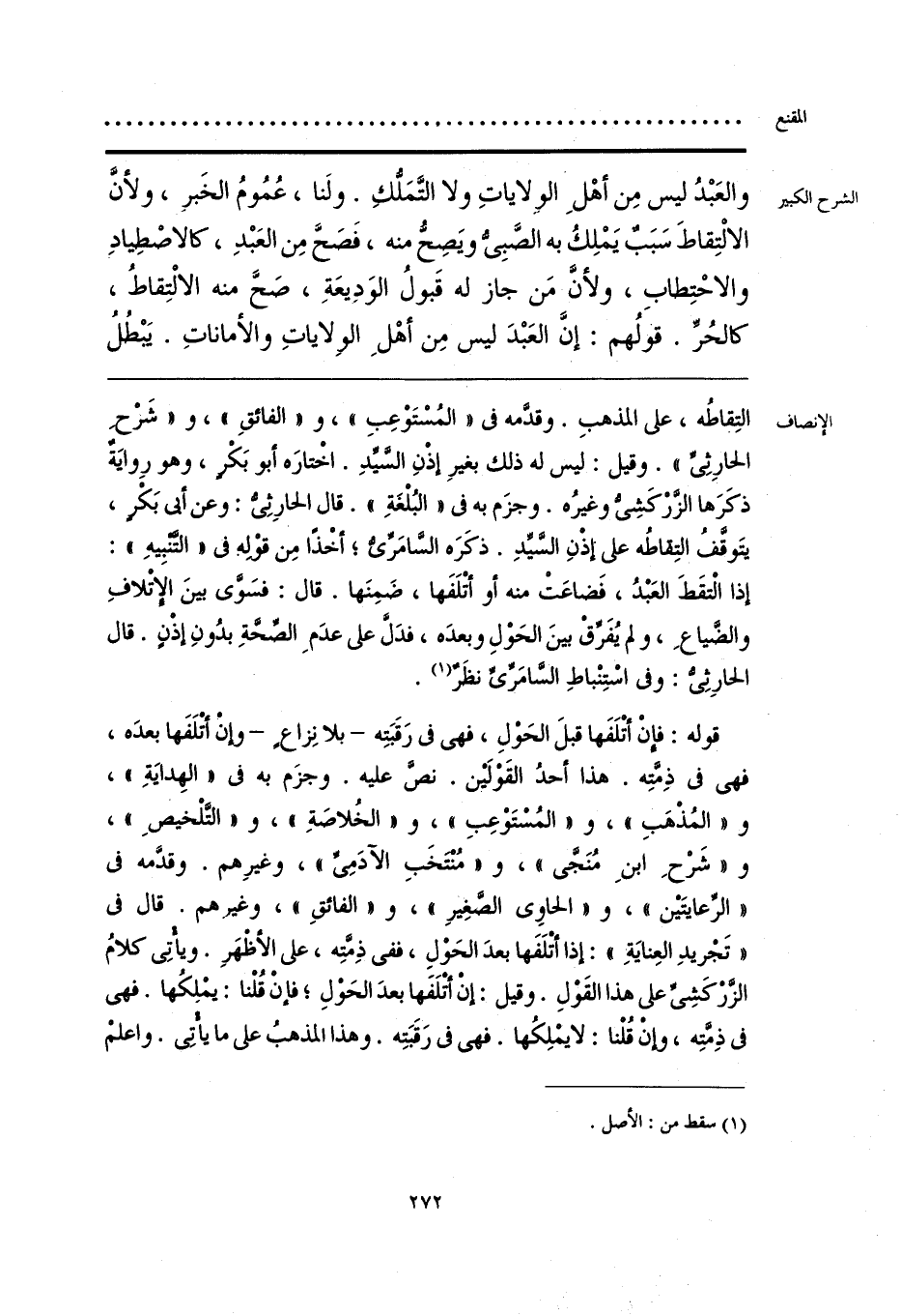 التِقاطُه، على المذهبِ. وقدَّمه في «المُسْتَوْعِب»، و «الفائقِ»، و «شَرْحِ الحارِثِيِّ». وقيل: ليس له ذلك بغيرِ إذْنِ السَّيِّدِ. اخْتارَه أبو بَكْرٍ، وهو رِوايَةٌ ذكَرَها الزَّرْكَشِيُّ وغيرُه. وجزَم به في «البُلْغَةِ». قال الحارِثِيُّ: وعن أبي بَكْرٍ، يتَوقَّفُ التِقاطُه على إذْنِ السَّيِّدِ. ذكَرَه السَّامَريُّ؛ أخْذًا مِن قوْل في «التَّنْبِيهِ»: إذا الْتقَطَ العَبْدُ، فَضاعَتْ منه أو أتْلَفَها، ضَمِنَها. قال: فسَوَّى بينَ الإتْلافِ والضَّياعِ، ولم يُفَرِّقْ بينَ الحَوْلِ وبعدَه، فدَلَّ على عدَمِ الصِّحَّةِ بدُونِ إذْنٍ. قال الحارِثِي: وفي اسْتِنْباطِ السَّامَرِّي نظَرٌ (¬1).