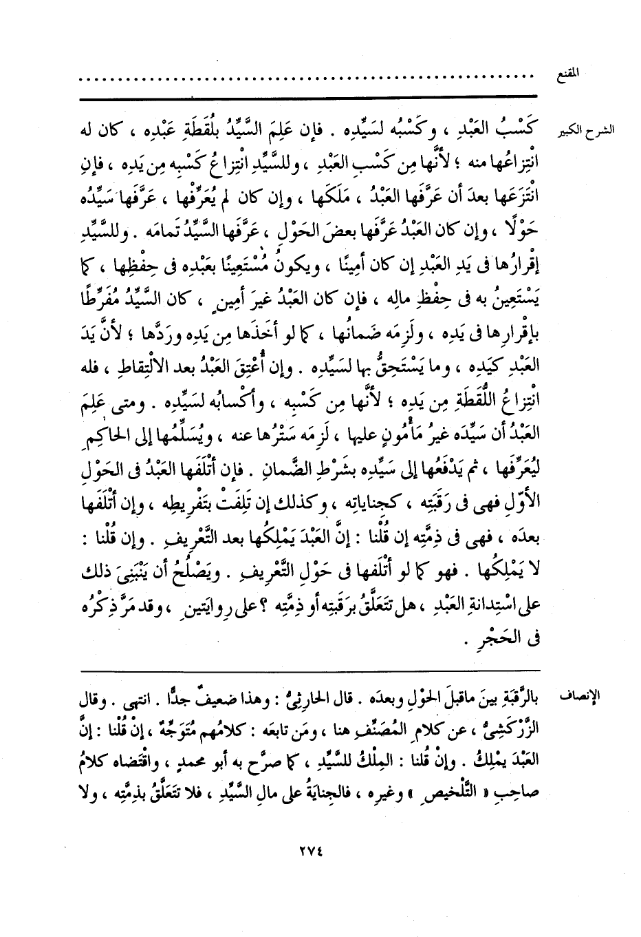 بالرَّقبَةِ بينَ ما قبلَ الحوْلِ وبعدَه. قال الحارِثِيُّ: وهذا ضعيفٌ جدًّا. انتهى. وقال الزَّرْكَشِيُّ، عن كلامِ المُصَنِّفِ هنا، ومَن تابعَه: كلامُهم مُتَوَجِّهٌ، إنْ قُلْنا: إنَّ العَبْدَ يمْلِكُ. وإنْ قُلنا: المِلْكُ للسَّيِّدِ، كما صرَّح به أبو محمدٍ، واقْتَضاه كلامُ صاحِبِ «التَّلْخيص» وغيرِه، فالجِنايَةُ على مالِ السَّيِّدِ، فلا تتَعَلَّقُ بذِمَّتِه، ولا