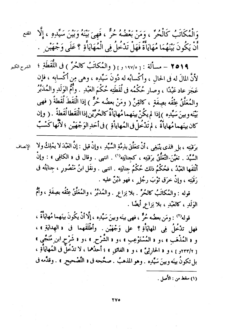 وَالْمُكَاتَبُ كَالْحُرِّ، وَمَنْ بَعْضُهُ حُرٌّ، فَهِيَ بَينَهُ وَبَينَ سَيِّدِهِ، إلا أَنْ يَكُونَ بَينَهُمَا مُهَايَأَةٌ فَهَلْ تَدْخُلُ فِي الْمُهَايَأةِ؟ عَلَى وَجْهَينِ.