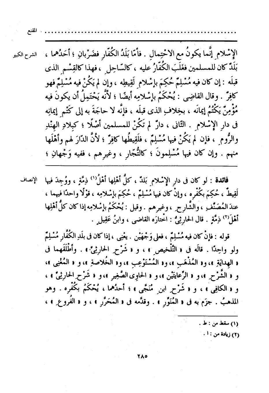 قوله: فإنْ كان فيه مُسْلِمٌ، فعلى وَجْهَين. يعْنِي، إذا كان في بلَدِ الكُفَّارِ مُسْلِمٌ ولو واحِدًا. قاله في «التَّلْخيصِ»، و «شَرْحِ الحارِثِيِّ». وأطْلَقَهما في «الهِدايَةِ»، و «المُذْهَبِ»، و «المُسْتَوْعِبِ»، و «الخُلاصةِ»، و «المُغني»، و «الشَّرْحِ» و «الرِّعايتَين»، و «الحاوي الصَّغِيرِ»، و «شَرْحِ الحارِثِيِّ»، و «الكافِي»، و «شَرْحِ ابنِ مُنَجَّى»؛ أحدُهما، يُحْكَمُ بكُفْرِه. وهو المذهبُ. جزَم به في «المُنَوِّرِ». وقدَّمه في «المُحَرَّرِ»، و «الفُروعِ»،