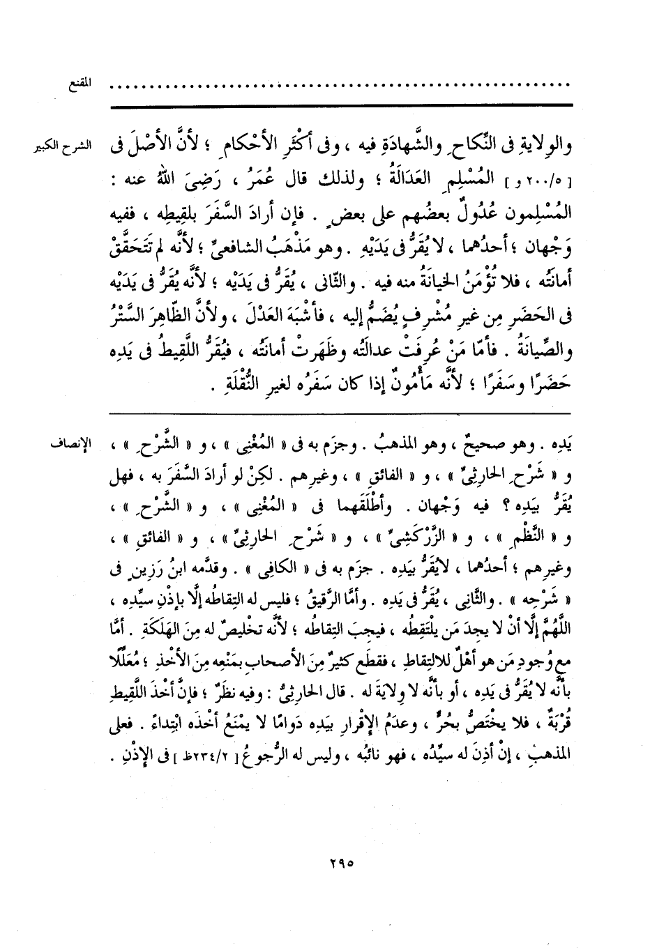 يَدِه. وهو صحيحٌ، وهو المذهبُ. وجزَم به في «المُغْنِي»، و «الشَّرْحِ»، و «شَرْحِ الحارِثِيِّ»، و «الفائقِ»، وغيرِهم. لكِنْ لو أرادَ السَّفَرَ به، فهل يُقَرُّ بيَدِه؟ فيه وَجْهان. وأطْلَقَهما في «المُغْنِي»، و «الشرْحِ»، و «النَّظْمِ»، و «الزَّرْكَشِيِّ»، و «شَرْحِ الحارِثِيِّ»، و «الفائقِ»، وغيرِهم؛ أحدُهما، لا يُقَرُّ بيَدِه. جزَم به في «الكافِي». وقدَّمه ابنُ رَزِينٍ في «شَرْحِه». والثَّانِي، يُقَرُّ في يَدِه. وأمَّا الرَّقيقُ؛ فليس له التِقاطُه إلَّا بإذْنِ سيِّدِه، اللَّهُمَّ إلَّا أن لا يجِدَ مَن يلْتَقِطُه، فيجِبَ التِقاطُه؛ لأنَّه تخْليصٌ له مِنَ الهَلَكَةِ. أمَّا مع وُجودِ مَن هو أهْلٌ للالتِقاطِ، فقطَع كثيرٌ مِنَ الأصحابِ بمَنْعِه مِنَ الأخْذِ؛ مُعَلِّلًا بأنَّه لا يُقَرُّ في يَدِه، أو بأنَّه لا ولايةَ له. قال الحارِثِيُّ: وفيه نظَرٌ؛ فإنَّ أخْذَ اللَّقِيطِ قُرْبَةٌ، فلا يخْتَصُّ بحُرٍّ، وعدَمُ الإقْرارِ بيَدِه دَوامًا لا يمْنَعُ أخْذَه ابْتِداءً. فعلى المذهب، إنْ أذِنَ له سيِّدُه، فهو نائبُه، وليس له الرُّجوعُ في الإذْنِ.