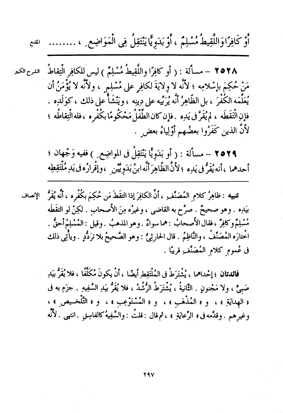 تنبيه: ظاهِرُ كلامِ المُصَنفِ، أنَّ الكافِرَ إذا التقَطَ مَن حُكِمَ بكُفْرِه، أنَّه يُقَرُّ بيَدِه. وهو صحيحٌ. صرَّح به القاضي، وغيرُه مِنَ الأصحابِ. لكِنْ لو التقَطَه مُسْلِمٌ وكافِرٌ، فقال الأصحابُ: هما سواءٌ. وهو المذهبُ. وقيل: المُسْلِمُ أحقُّ. اخْتارَه المُصَنِّفُ، والنَّاظِمُ. قال الحارِثِيُّ: وهو الصَّحيحُ بلا ترَدُّدٍ. ويأْتِي ذلك في عُمومِ كلامِ المُصَنِّفِ قريبًا.