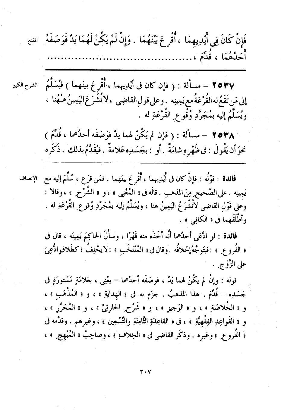 قوله: وإنْ لم يكُنْ لهما يَدٌ، فوصَفَه أحدُهما -يعْني، بعَلامَةٍ مَسْتورَةٍ في جَسَدِه- قُدِّمَ. هذا المذهبُ. جزَم به في «الهِدايَةِ»، و «المُذْهَبِ»، و «الخُلاصَةِ»، و «الوَجيزِ»، و «شَرْحِ الحارِثِيِّ»، و «المُحَرَّرِ»، و «القَواعِدِ الفِقْهِيَّةِ»، في «القاعِدَةِ الثَّامِنَةِ والتِّسْعِين»، وغيرِهم. وقدَّمه في «الفُروعِ» وغيرِه. وذكَر القاضي في «الخِلافِ»، وصاحِبُ «المُبْهِجِ»،
