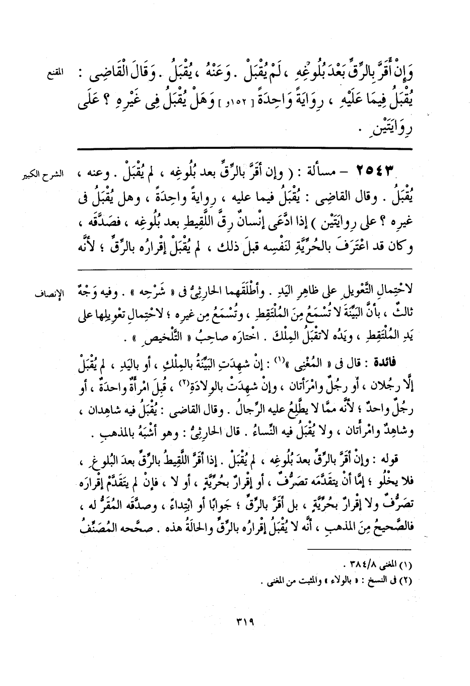 قوله: وإنْ أقَرَّ بالرِّقِّ بعدَ بُلُوغِه، لم يُقْبَلْ. إذا أقَرَّ اللَّقِيطُ بالرِّقِّ بعدَ البُلوغِ، فلا يخْلُو؛ إمَّا أنْ يتقَدَّمَه تصَرُّفٌ، أو إقْرارٌ بحُرِّيَّةٍ، أو لا، فإنْ لم يتَقَدَّمْ إقرارَه تصَرُّفٌ ولا إقْرارٌ بحُرِّيَّةٍ، بل أقَرَّ بالرِّقِّ؛ جَوابًا أو ابْتِداءً، وصدَّقَه المُقَرُّ له، فالصَّحيحُ مِنَ المذهبِ، أنَّه لا يُقْبَلُ إقْرارُه بالرِّقِّ والحالةُ هذه. صحَّحه المُصَنِّفُ