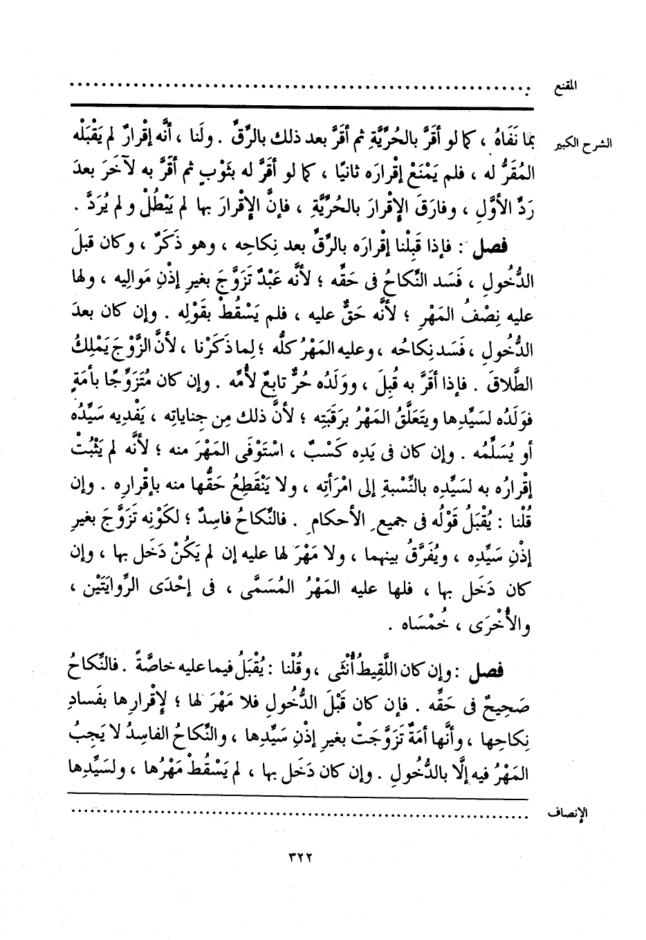 فصل: فإذا قَبِلْنا إقْرارَه بالرِّقِّ بعد نِكاحِه، وهو ذَكَرٌ، وكان قبلَ الدُّخُولِ، فَسَد النِّكاحُ في حَقِّه؛ لأنَّه عَبْدٌ تَزَوَّجَ بغيرِ إذْنِ مَوالِيه، ولها عليه نِصْفُ المَهْرِ؛ لأنَّه حَق عليه، فلم يَسْقُطْ بقَوْلِه. وإن كان بعدَ الدُّخُولِ، فَسَد نِكاحُه، وعليه المَهْرُ كلُّه؛ لِما ذَكَرْنا، لأنَّ الزَّوْجَ يَمْلِكُ الطَّلاقَ. فإذا أقَرَّ به قُبِلَ، ووَلَدُه حُرٌّ تابعٌ لأُمِّه. وإن كان مُتَزَوِّجًا بأمَةٍ فوَلَدُه لسَيِّدِها ويتَعَلَّقُ المَهْرُ برَقَبَتِه؛ لأنَّ ذلك مِن جِناياتِه، يَفْدِيه سَيِّدُه أو يُسَلِّمُه. وإن كان في يَدِه كَسْبٌ، اسْتَوْفَى المَهْرَ منه؛ لأنَّه لم يَثْبُتْ إقْرارُه به لسَيِّدِه بالنِّسْبةِ إلى امْرَأتِه، ولا يَنْقَطِعُ حَقُّها منه بإقْرارِه. وإن قُلْنا: يُقْبَلُ قَوْلُه في جميعِ الأحكامِ. فالنِّكاحُ فاسِدٌ؛ لكَوْنِه تَزَوَّجَ بغيرِ إذْنِ سَيِّدِه، ويُفَرَّقُ بينهما، ولا مَهْرَ لها عليه إن لم يَكُنْ دَخَل بها، وإن كان دَخَل بها، فلها عليه المَهْرُ المُسَمَّى، في إحْدَى الرِّوايَتَين، والأُخْرَى، خُمْسَاه.