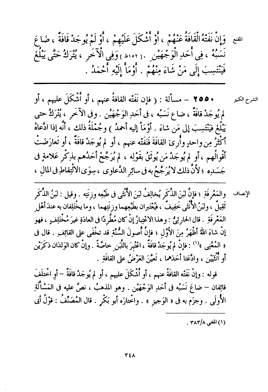 قوله: وإنْ نَفَتْه القافَةُ عنهم، أو أُشْكَلَ عليهم، أو لم يُوجَدْ قافَةٌ -أو اخْتلَفَ قائِفان- ضاعَ نَسَبُه في أحَدِ الوَجْهَين. وهو المذهبُ، نصَّ عليه في المَسْالةِ الأولَى. وجزَم به في «الوَجيزِ». واخْتارَه أبو بَكْرٍ. قال المُصَنِّفُ: قوْلُ أبي