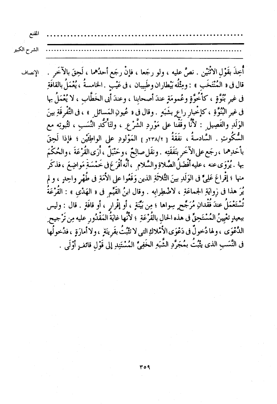 أُخِذَ بقَوْلِ الاثْنَين. نصَّ عليه، ولو رجَعا، فإنْ رجَع أحدُهما، لَحِقَ بالآخَرِ. قال في «المُنْتَخَب»: ومِثْلُه بَيطاران وطَبِيبان، في عَيبٍ. الخامسةُ، يُعْمَلُ بالقافَةِ في غيرِ بُنُوَّةٍ، كأخُوَّةٍ وعُمومَةٍ عندَ أصحابِنا، وعندَ أبي الخَطَّابِ، لا يُعْمَلُ بها في غيرِ البُنُوَّةِ، كإخْبارِ راعٍ بشَبَهٍ. وقال في «عُيونِ المَسائلِ»، في التَّفْرِقَةِ بينَ الوَلَدِ والفَصِيلِ: لأنَّا وقَفْنا على مَوْرِدِ الشَّرْعِ، ولتَأكُّدِ النَّسَبِ، لثُبوتِه مع السُّكُوتِ. السَّادسةُ، نفَقَةُ المَوْلودِ على الواطِئَين؛ فإذا لَحِقَ بأحَدِهما، رجَع على الآخَرِ بنَفَقَتِه. ونقَل صالِحٌ، وحَنْبَلٌ، أرَى القُرْعَةَ، والحُكْمَ بها. يُرْوَى عنه، عليه أفْضَلُ الصلاةِ والسَّلامِ، أنَّه أقْرَعَ في خَمْسَةِ مَواضِعَ، فذكَر منها؛ إقْراعَ عَلِيٍّ في الوَلَدِ بينَ الثلاثةِ الذين وَقَعُوا على الأمَةِ في طُهْرٍ واحِدٍ، ولم يُرَ هذا في رِوايَةِ الجماعَةِ، لاضْطِرابِه. وقال ابنُ القَيِّمِ في «الهَدْي»: القُرْعَة تُسْتَعْمَلُ عندَ فُقْدانِ مُرَجِّحٍ سِواها؛ مِن بَينة، أو إقْرار، أو قافَةٍ. قال: وليس ببعيدٍ تعْيينُ المُسْتَحِقِّ في هذه الحالِ بالقرْعَةِ؛ لأنها غايَةُ المَقدُورِ عليه مِن ترْجيحِ الدَّعْوَى، ولها دُخولٌ في دَعْوَى الأمْلاكِ التي لا تثْبُتُ بقَرِينة، ولا أمارَةٍ، فدُخولُها في النَّسَبِ الذي يثْبُتُ بمُجَرَّدِ الشَّبَهِ الخَفِيِّ المُسْتَنِدِ إلى قَوْلِ قائفٍ أوْلَى.