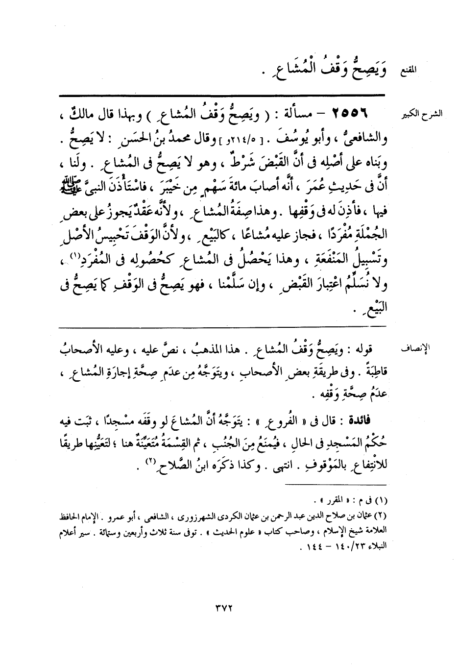 فائدة: قال في «الفُروعِ»: يتَوَجَّهُ أنَّ المُشاعَ لو وقَفَه مسْجِدا، ثبَت فيه حُكْمُ المَسْجِدِ في الحالِ، فيُمنَعُ مِنَ الجُنُبِ، ثم القِسْمَةُ مُتَعَيِّنَةٌ هنا؛ لتَعَيُّنها طريقا للانْتِفاعِ بالمَوْقوفِ. انتهى. وكذا ذكَرَه ابنُ الصَّلاحِ (¬1).