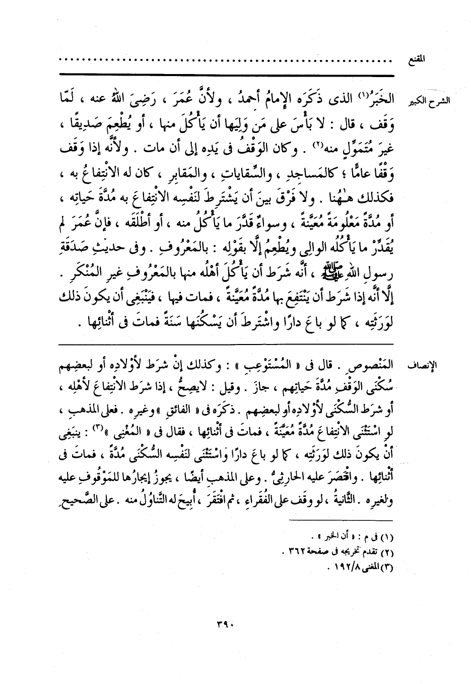 المَنْصوصِ. قال في «المُسْتَوْعِبِ»: وكذلك إنْ شرَط لأوْلادِه أو لبعضِهم سُكْنَى الوَقْفِ مُدَّةَ حَياتِهم، جازَ. وقيل: لا يصِحُّ، إذا شرَط الانْتِفاعَ لأهْلِه، أو شرَط السُّكْنَى لأوْلادِه أو لبعضِهم. ذكَرَه في «الفائقِ» وغيرِه. فعلى المذهبِ، لو اسْتَثْنَى الانْتِفاعَ مُدَّةً مُعَينةً، فماتَ في أثْنائِها، فقال في «المُغْنِي» (¬1): ينبَغِي أنْ يكونَ ذلك لوَرَثَتِه، كما لو باعَ دارًا واسْتَثْنَى لنَفْسِه السُّكْنَى مُدَّةً، فماتَ في أثْنائِها. واقتصَرَ عليه الحارِثِيُّ. وعلى المذهبِ أيضًا، يجوزُ إيجارُها للمَوْقُوفِ عليه ولغيرِه. الثانيةُ، لو وقَف على الفُقَراءِ، ثم افْتَقَرَ، أُبِيحَ له التَّناوُلُ منه. على الصحيحِ