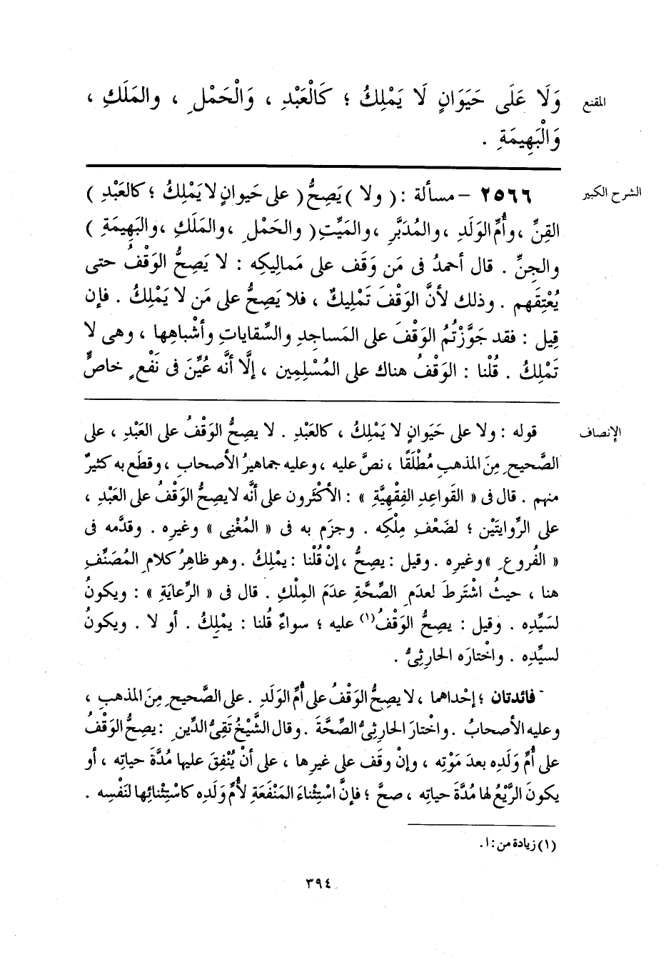 قوله: ولا على حَيَوانٍ لا يَمْلِكُ، كالعَبْدِ. لا يصِحُّ الوَقْفُ على العَبْدِ، على الصَّحيحِ مِنَ المذهبِ مُطْلَقًا، نصَّ عليه، وعليه جماهيرُ الأصحابِ، وقطَع به كثير منهم. قال في «القَواعِدِ الفِقْهِيَّةِ»: الأكْثرَون على أنَّه لا يصِحُّ الوَقْف على العَبْدِ، على الروايتَين؛ لضَعْفِ مِلْكِه. وجزَم به في «المُغْنِي» وغيرِه. وقَدَّمه في «الفُروعِ» وغيرِه. وقيل: يصِحُّ، إنْ قُلْنا: يمْلِكُ. وهو ظاهِرُ كلامِ المُصَنِّفِ هنا، حيثُ اشْتَرطَ لعدَمِ الصِّحَّةِ عدَمَ المِلْكِ. قال في «الرِّعايَةِ»: ويكونُ لسَيِّدِه. وقيل: يصِحُّ الوَقْفُ (¬1) عليه؛ سواءٌ قُلنا: يمْلِكُ. أو لا. ويكونُ لسيدِه. واخْتارَه الحارِثِيُّ.