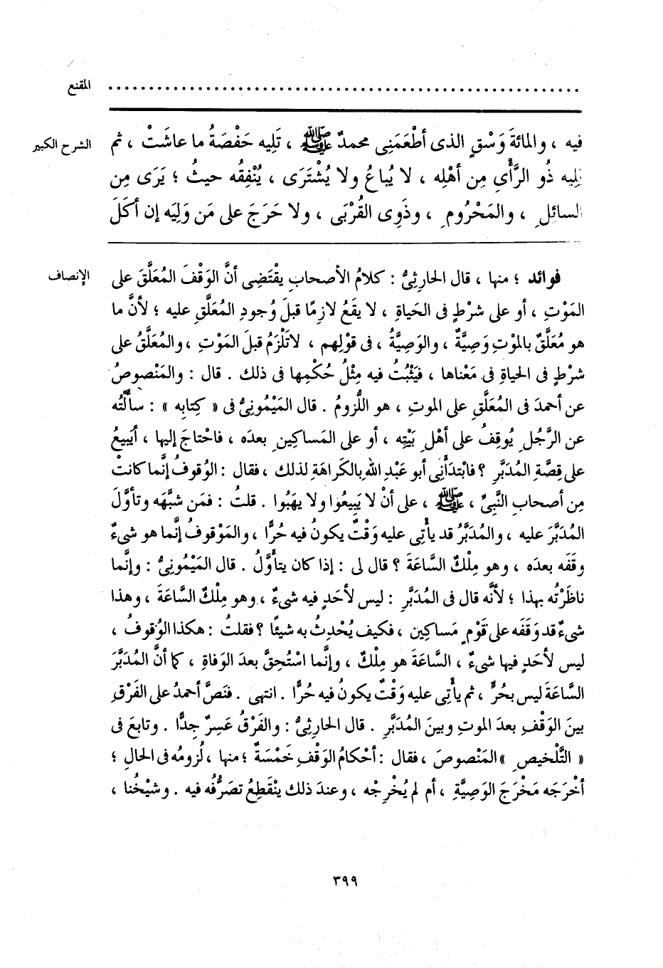 فوائد؛ منها، قال الحارِثِي: كلامُ الأصحاب يقْتَضِي أنَّ الوَقْفَ المُعَلَّقَ على المَوْتِ، أو على شرْطٍ في الحَياةِ، لا يقَعُ لازِمًا قبلَ وُجودِ المُعَلقِ عليه؛ لأنَّ ما هو مُعَلق بالموْتِ وَصِية، والوَصِيةُ، في قوْلِهم، لا تَلْزَمُ قبلَ المَوْتِ، والمُعَلقُ على شرْطٍ في الحياةِ في مَعْناها، فيَثْبُتُ فيه مِثْلُ حُكْمِها في ذلك. قال: والمَنْصوصُ عن أحمدَ في المُعَلَّقِ على الموتِ، هو اللُّزومُ. قال المَيمُونِيُّ في «كِتابِه»: سألتُه عن الرجُلِ يُوقِفُ على أهْلِ بَيته، أو على المَساكِينِ بعدَه، فاحْتاجَ إليها، أيبيعُ على قِصّةِ المُدَبَّرِ؟ فابْتدَأنِي أبو عَبْدِ اللهِ بالكَراهَةِ لذلك، فقال: الوُقوفُ إنما كانت مِن أصحابِ النّبِيِّ - صلى الله عليه وسلم - على أنْ لا يَبيعُوا ولا يهَبُوا. قلتُ: فمَن شبّهَه وتأوَّلَ المُدَبَّرَ عليه، والمُدَبَّرُ قد يأتِي عليه وَقْتَ يكونُ فيه حُرًّا، والمَوْقوفُ إنما هو شيء وقَفَه بعدَه، وهو مِلْكٌ الساعَةَ؟ قال لي: إذا كان يتأوَّلُ. قال المَيمُونِيُّ: وإنَّما ناظَرْتُه بهذا؛ لأنه قال في المُدَبرِ: ليس لأحَدٍ فيه شيء، وهو مِلْك السَّاعَةَ، وهذا شيء قد وَقَفَه على قوْمٍ مَساكِين، فكيف يُحْدِثُ به شيئًا؟ فقلتُ: هكذا الوُقوفُ، ليس لأحَدٍ فيها شيء، السَّاعَةَ هو مِلْك، وإنَّما اسْتُحِقَّ بعدَ الوَفاةِ، كما أنَّ المُدَبَّرَ السَّاعَةَ ليس بحُرٍّ، ثم يأتِي عليه وَقْت يكونُ فيه حُرا. انتهى. فنَص أحمدُ على الفَرْق بينَ الوَقْفِ بعدَ الموتِ وبينَ المُدَبرِ. قال الحارِثِيُّ: والفَرقُ عَسِر جِدًّا. وتابعَ في «التَّلْخيصِ» المَنْصوصَ، فقال: أحْكامُ الوَقْفِ خَمْسَة؛ منها، لُزومُه في الحالِ؛ أخْرَجَه مَخْرَجَ الوَصِيَّةِ، أم لم يُخْرِجْه، وعندَ ذلك ينْقَطِعُ تصَرفُه فيه. وشيخُنا،