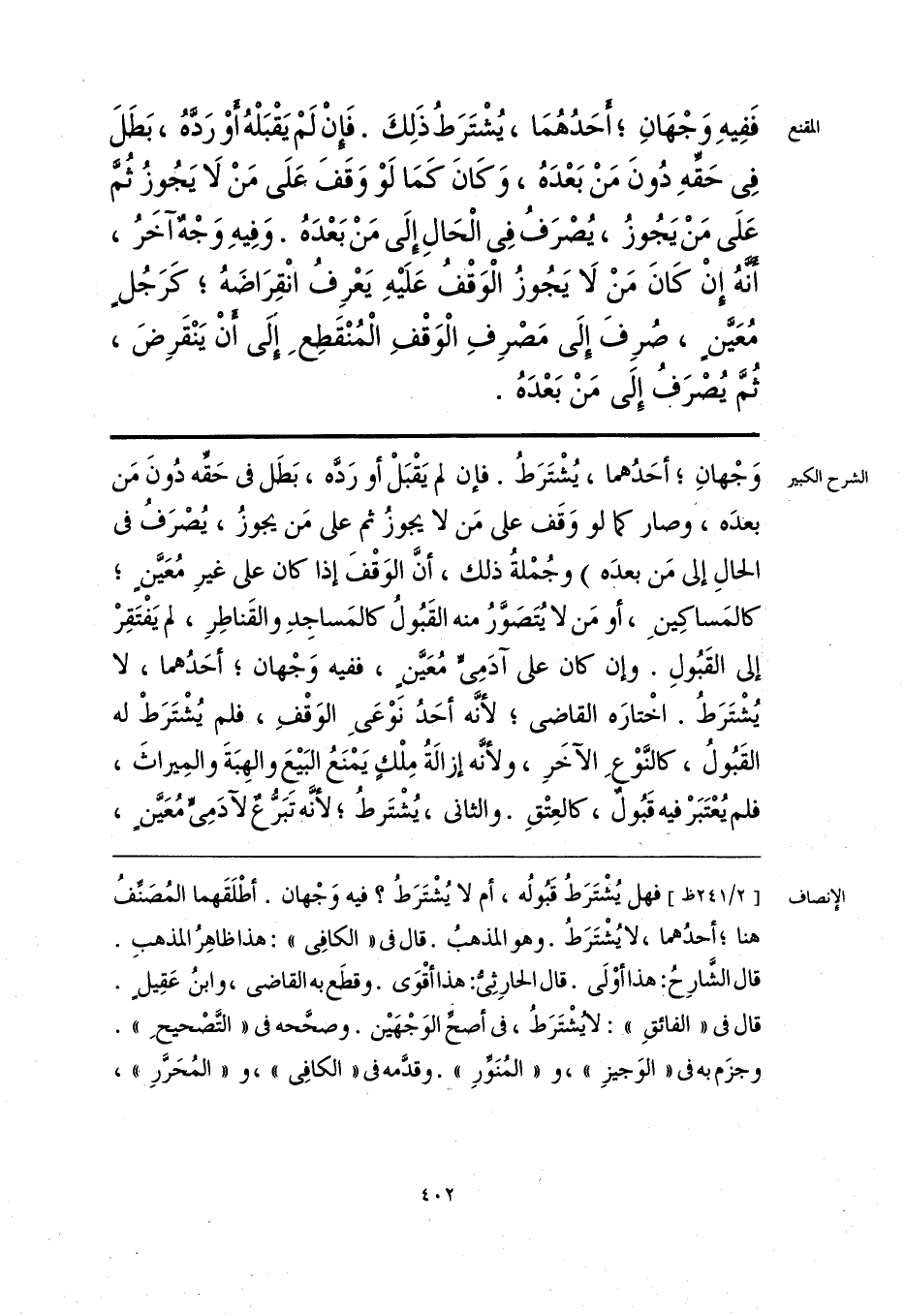 فَفِيهِ وَجْهَانِ؛ أحَدُهُمَا، يُشْتَرَطُ ذَلِكَ. فَإن لَمْ يَقْبَلْهُ أوْ رَدَّهُ، بَطَلَ فِي حَقِّهِ دُونَ مَنْ بَعْدَهُ، وَكَانَ كَمَا لَوْ وَقَفَ عَلَى مَنْ لَا يَجُوزُ ثُمَّ عَلَى مَنْ يَجُوزُ، يُصْرَفُ فِي الْحَالِ إلَى مَنْ بَعْدَهُ. وَفِيهِ وَجْهٌ آخَرُ، أنهُ أنْ كَانَ مَنْ لَا يَجُوزُ الْوَقْفُ عَلَيه يَعْرِفُ انْقِرَاضَهُ؛ كَرَجُل مُعَيَّن، صُرِفَ إلَى مَصْرِفِ الْوَقْفِ الْمُنْقَطِعِ إلَى أنْ يَنْقَرِضَ، ثُمَّ يُصْرَفُ إِلَى مَنْ بَعْدَهُ.