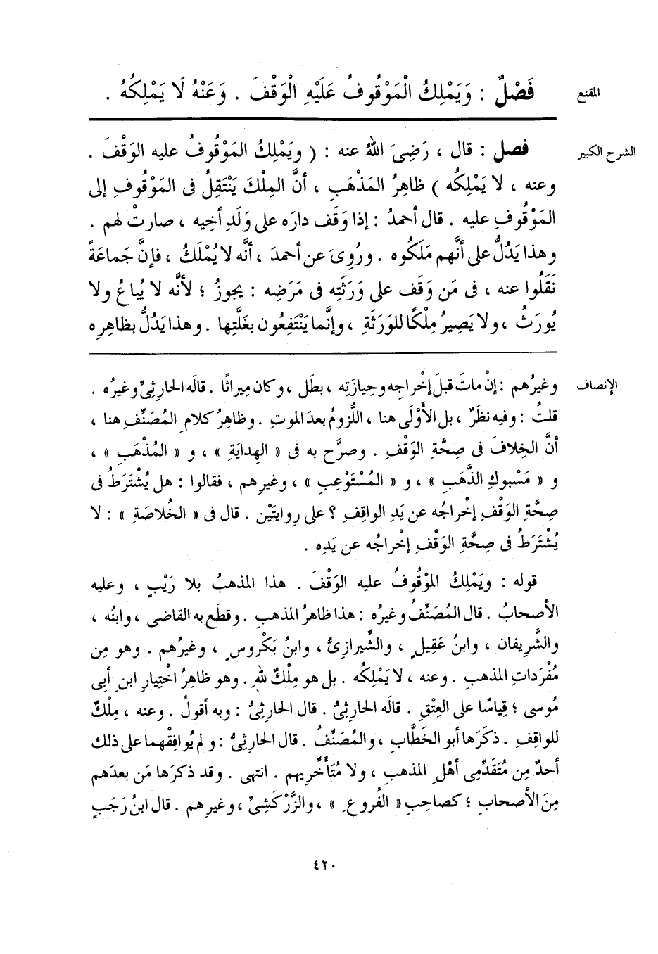 قوله: ويَمْلِكُ الموْقُوفُ عليه الوَقْف. هذا المذهبُ بلا رَيب، وعليه الأصحابُ. قال المُصَنِّفُ وغيرُه: هذا ظاهرُ المذهبِ. وقطَع به القاضي، وابنُه، والشَّرِيفان، وابنُ عَقِيل، والشِّيرازِيُّ، وابنُ بَكْروس، وغيرُهم. وهو مِن مُفْرَداتِ المذهبِ. وعنه، لا يَمْلِكُه. بل هو مِلْكٌ لله. وهو ظاهِرُ اخْتِيارِ ابنِ أبِي مُوسى؛ قِياسًا على العِتْقِ. قاله الحارِثِيُّ. قال الحارِثِيُّ: وبه أقولُ. وعنه، مِلْكٌ للواقِف. ذكَرَها أبو الخَطَّابِ، والمُصَنِّفُ. قال الحارِثِيُّ: ولم يُوافِقْهما على ذلك أحد مِن مُتَقَدِّمِي أهْلِ المذهبِ، ولا مُتَأخرِيهم. انتهى. وقد ذكرَها مَن بعدَهم مِنَ الأصحابِ؛ كصاحِبِ «الفُروعِ»، والزَّرْكَشي، وغيرِهم. قال ابنُ رَجَب